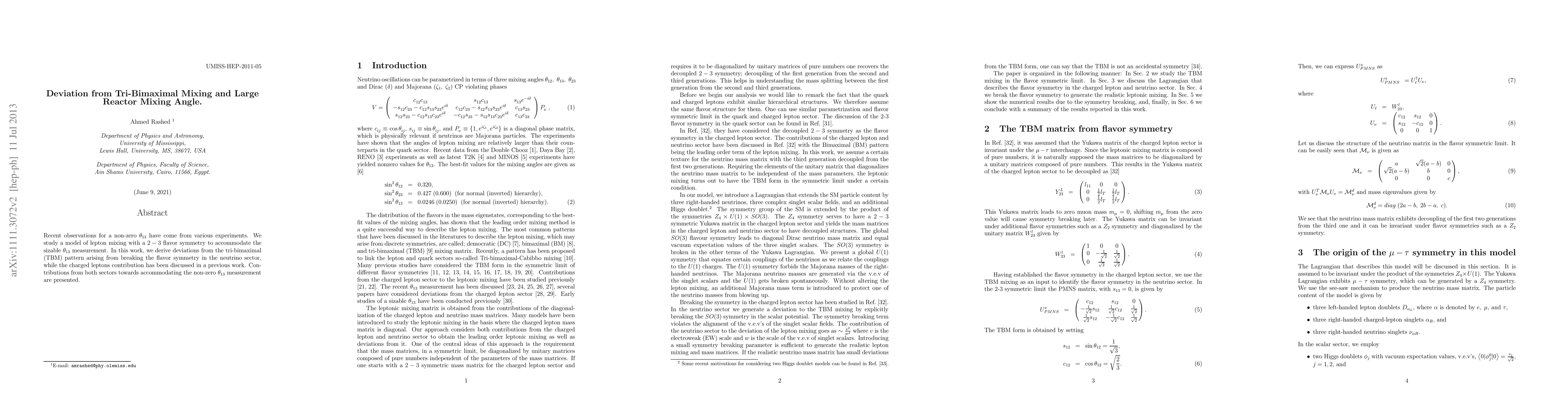 This paper explores a lepton mixing model with a 2-3 flavor symmetry to accommodate the sizable non-zero $\theta_{13}$ measurement, deriving deviations from the tri-bimaximal pattern through symmetry breaking in the neutrino sector. It also discusses contributions from both neutrino and charged lepton sectors to fit the observed mixing angle.