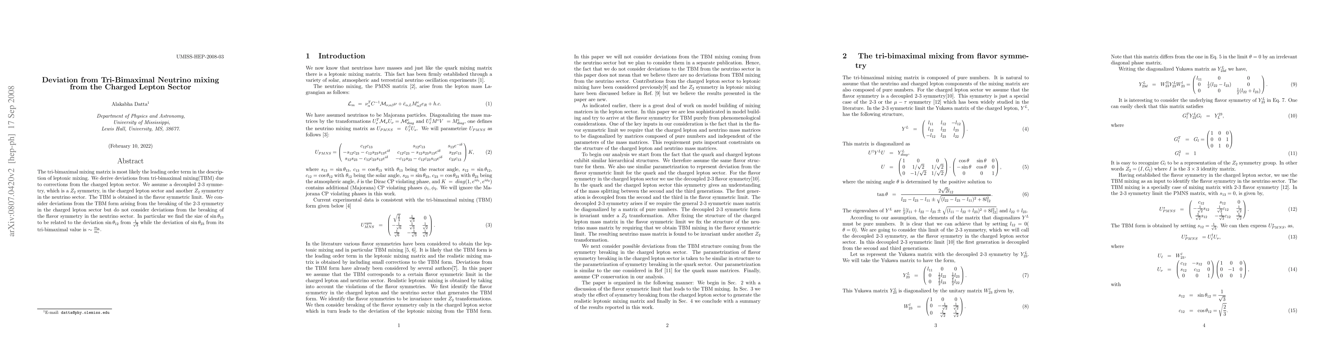 The tri-bimaximal mixing matrix is most likely the leading order term in the description of leptonic mixing. We derive deviations from tri-bimaximal mixing(TBM) due to corrections from the charged lepton sector. We assume a decoupled 2-3 symmetry, which is a $Z_2$ symmetry, in the charged lepton sector and another $Z_2$ symmetry in the neutrino sector. The TBM is obtained in the flavor symmetric limit. We consider deviations from the TBM form arising from the breaking of the 2-3 symmetry in the charged lepton sector but do not consider deviations from the breaking of the flavor symmetry in the neutrino sector. In particular we find the size of $\sin{\theta_{13}}$ to be related to the deviation $\sin{\theta_{12}}$ from $\sqrt{1/3}$ while the deviation of $\sin{\theta_{23}}$ from its tri-bimaximal value is $ \sim {m_{\mu} \over m_{\tau}}$.
