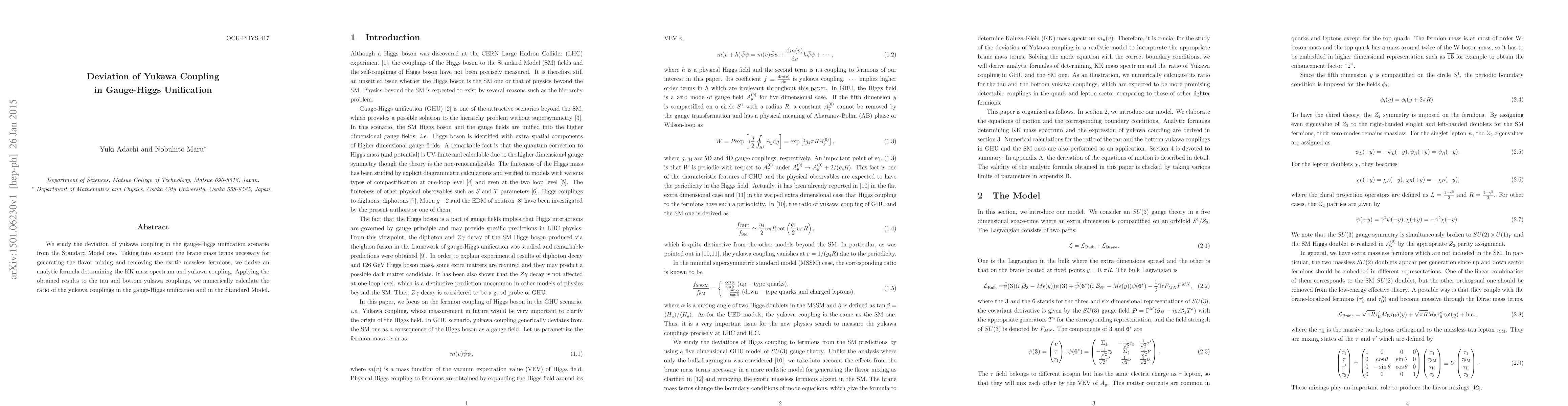 This paper investigates the deviation of Yukawa coupling in the gauge-Higgs unification framework compared to the Standard Model, deriving an analytical formula for the KK mass spectrum and Yukawa coupling while considering brane mass terms. Numerical calculations show the ratio of Yukawa couplings for tau and bottom quarks in this model.