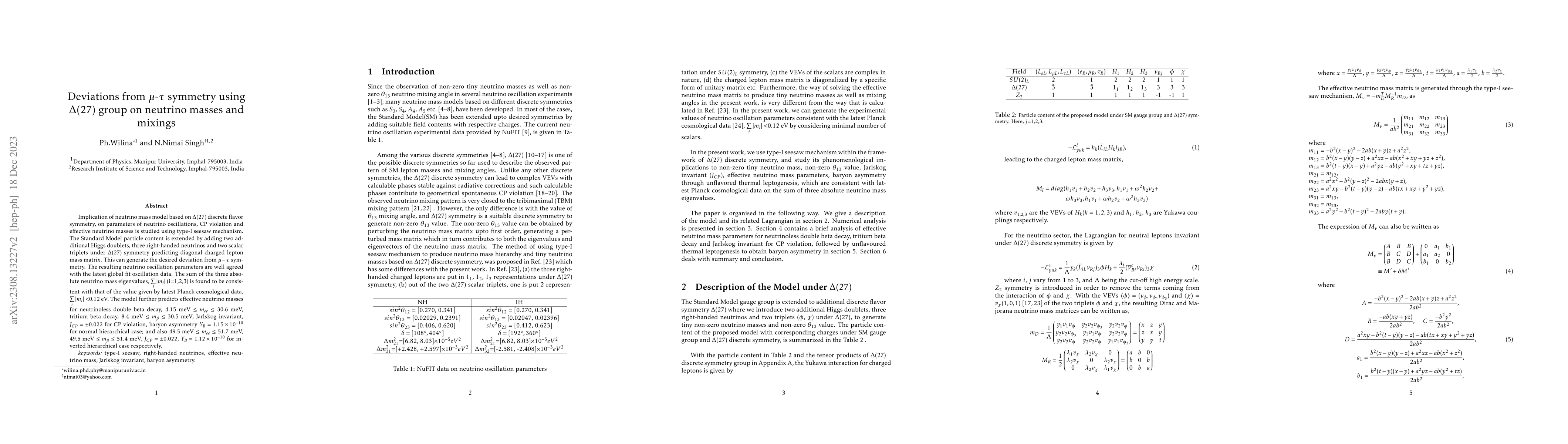 Implication of neutrino mass model based on $\Delta$(27) discrete flavor symmetry, on parameters of neutrino oscillations, CP violation and effective neutrino masses is studied using type-I seesaw mechanism. The Standard Model particle content is extended by adding two additional Higgs doublets, three right-handed neutrinos and two scalar triplets under $\Delta$(27) symmetry predicting diagonal charged lepton mass matrix. This can generate the desired deviation from $\mu - \tau$ symmetry. The resulting neutrino oscillation parameters are well agreed with the latest global fit oscillation data. The sum of the three absolute neutrino mass eigenvalues, $\sum\limits_{i}|m_{i}|$ (i=1,2,3) is found to be consistent with that of the value given by latest Planck cosmological data, $\sum\limits_{i}|m_{i}|<$0.12 eV. The model further predicts effective neutrino masses for neutrinoless double beta decay, 4.15 meV $\leq m_{ee}\leq$ 30.6 meV, tritium beta decay, 8.4 meV $\leq m_{\beta}\leq$ 30.5 meV, Jarlskog invariant, $J_{CP}=\pm 0.022$ for CP violation, baryon asymmetry $Y_{B}=1.15 \times 10^{-10}$ for normal hierarchical case; and also 49.5 meV $\leq m_{ee}\leq$ 51.7 meV, 49.5 meV $\leq m_{\beta}\leq$ 51.4 meV, $J_{CP}=\pm 0.022$, $Y_{B}=1.12\times 10^{-10}$ for inverted hierarchical case respectively.