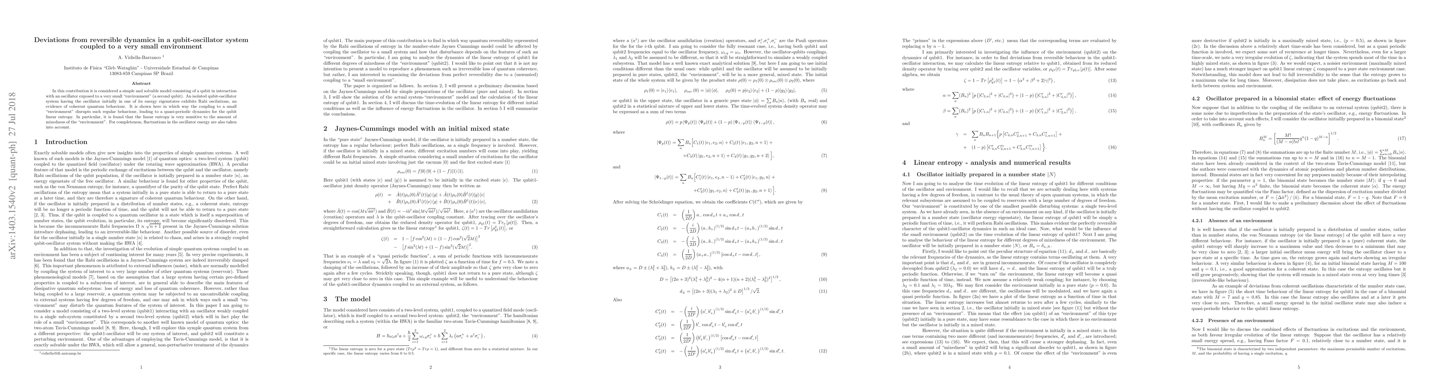 In this contribution it is considered a simple and solvable model consisting of a qubit in interaction with an oscillator exposed to a very small "environment" (a second qubit). An isolated qubit-oscillator system having the oscillator initially in one of its energy eigenstates exhibits Rabi oscillations, an evidence of coherent quantum behaviour. It is shown here in which way the coupling to a small "environment" disrupts such regular behaviour, leading to a quasi-periodic dynamics for the qubit linear entropy. In particular, it is found that the linear entropy is very sensitive to the amount of mixedness of the "environment". For completeness, fluctuations in the oscillator energy are also taken into account.