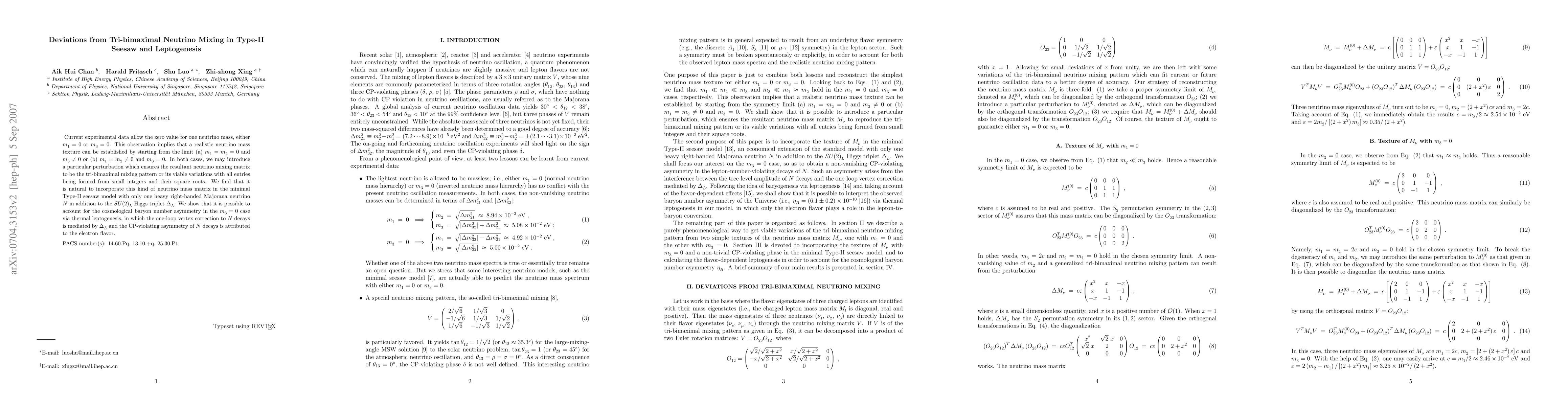 Current experimental data allow the zero value for one neutrino mass, either m_1 = 0 or m_3 = 0. This observation implies that a realistic neutrino mass texture can be established by starting from the limit (a) m_1 = m_2 = 0 and m_3 \neq 0 or (b) m_1 = m_2 \neq 0 and m_3 = 0. In both cases, we may introduce a particular perturbation which ensures the resultant neutrino mixing matrix to be the tri-bimaximal mixing pattern or its viable variations with all entries being formed from small integers and their square roots. We find that it is natural to incorporate this kind of neutrino mass matrix in the minimal Type-II seesaw model with only one heavy right-handed Majorana neutrino N in addition to the SU(2)_L Higgs triplet \Delta_L. We show that it is possible to account for the cosmological baryon number asymmetry in the m_3 =0 case via thermal leptogenesis, in which the one-loop vertex correction to N decays is mediated by \Delta_L and the CP-violating asymmetry of N decays is attributed to the electron flavor.