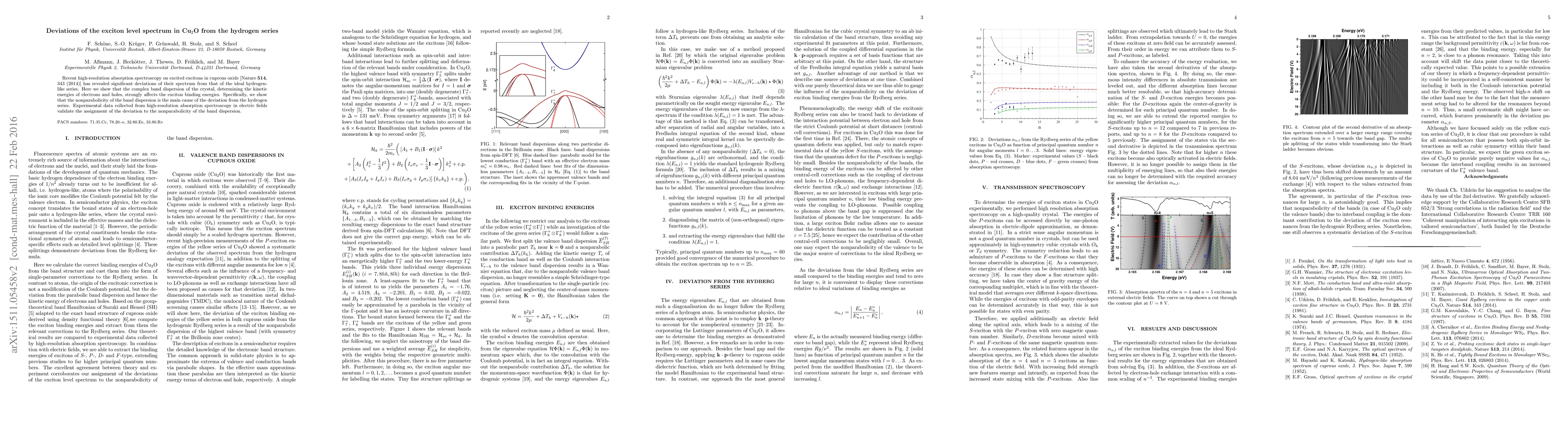 Recent high-resolution absorption spectroscopy on excited excitons in cuprous oxide [Nature (London) 514, 343 (2014)] has revealed significant deviations of their spectrum from that of the ideal hydrogen-like series. Here we show that the complex band dispersion of the crystal, which determines the kinetic energy of electrons and holes, strongly affects the exciton binding energy. Specifically, we show that the nonparabolicity of the band dispersion is the main cause of the deviation from the hydrogen series. Experimental data collected from high-resolution absorption spectroscopy in electric fields validate the assignment of the deviation to the nonparabolicity of the band dispersion.