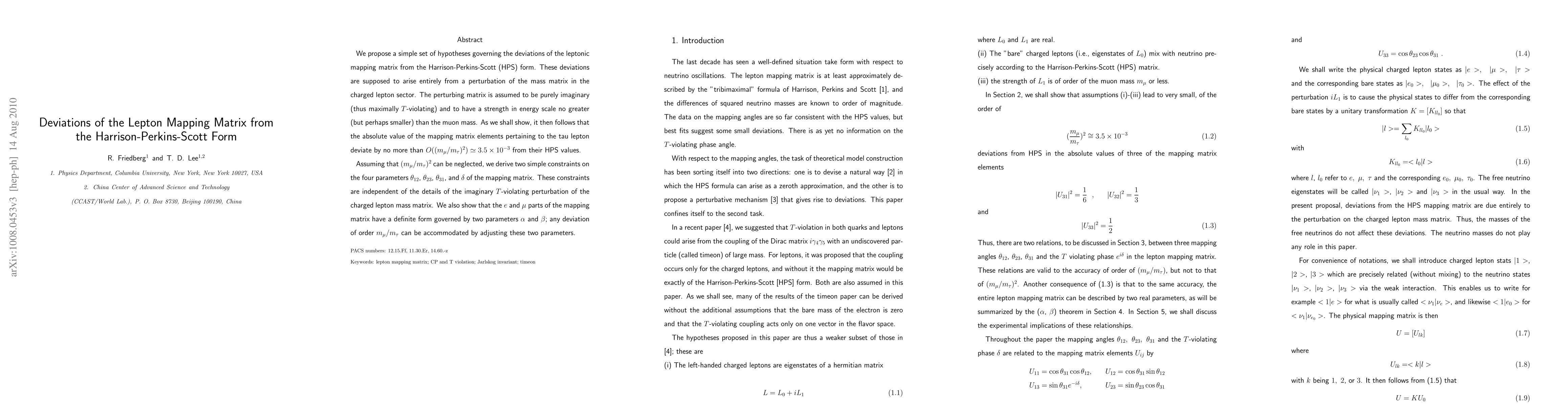 We propose a simple set of hypotheses governing the deviations of the leptonic mapping matrix from the Harrison-Perkins-Scott (HPS) form. These deviations are supposed to arise entirely from a perturbation of the mass matrix in the charged lepton sector. The perturbing matrix is assumed to be purely imaginary (thus maximally $T$-violating) and to have a strength in energy scale no greater (but perhaps smaller) than the muon mass. As we shall show, it then follows that the absolute value of the mapping matrix elements pertaining to the tau lepton deviate by no more than $O((m_\mu/m_\tau)^2) \simeq 3.5 \times 10^{-3}$ from their HPS values. Assuming that $(m_\mu/m_\tau)^2 $ can be neglected, we derive two simple constraints on the four parameters $\theta_{12}$, $\theta_{23}$, $\theta_{31}$, and $\delta$ of the mapping matrix. These constraints are independent of the details of the imaginary $T$-violating perturbation of the charged lepton mass matrix. We also show that the $e$ and $\mu$ parts of the mapping matrix have a definite form governed by two parameters $\alpha$ and $\beta$; any deviation of order $m_\mu/m_\tau $ can be accommodated by adjusting these two parameters.