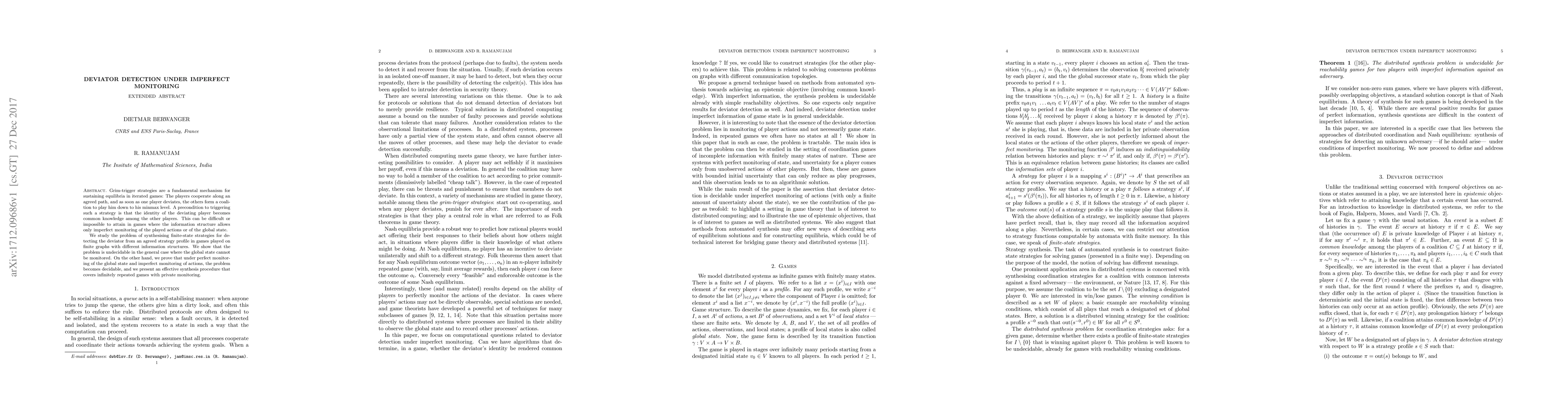 Researchers studied how to detect a deviator in games where information is imperfectly monitored, finding that detecting deviators is undecidable in general cases but decidable with perfect monitoring of the global state or actions.