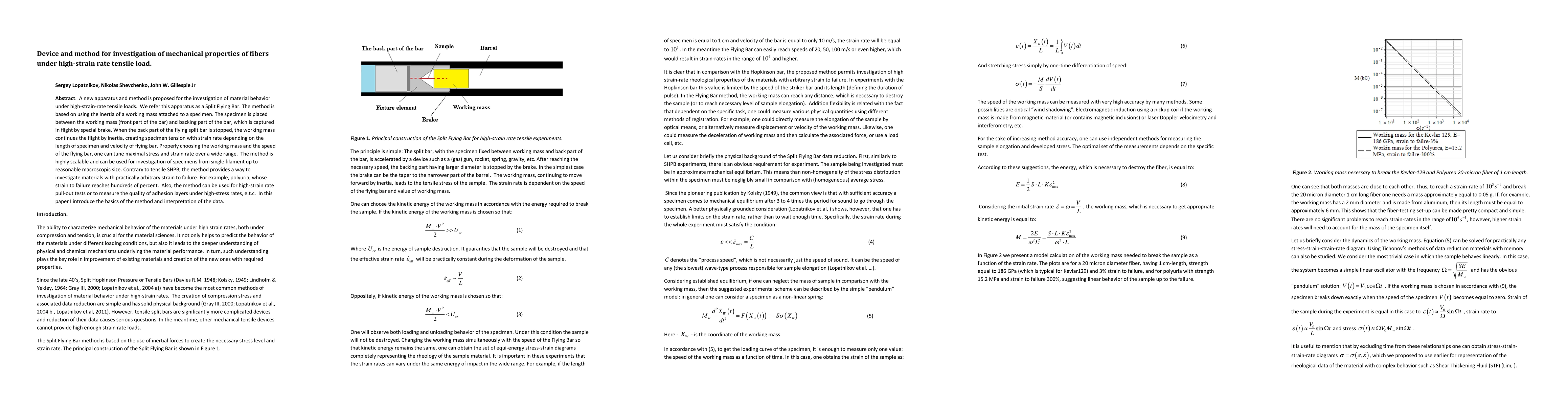 This paper introduces a Split Flying Bar apparatus for investigating material behavior under high-strain-rate tensile loads, utilizing inertia to create tension. The method allows for scalable testing from single filaments to macroscopic sizes and can accommodate materials with high strain to failure.
