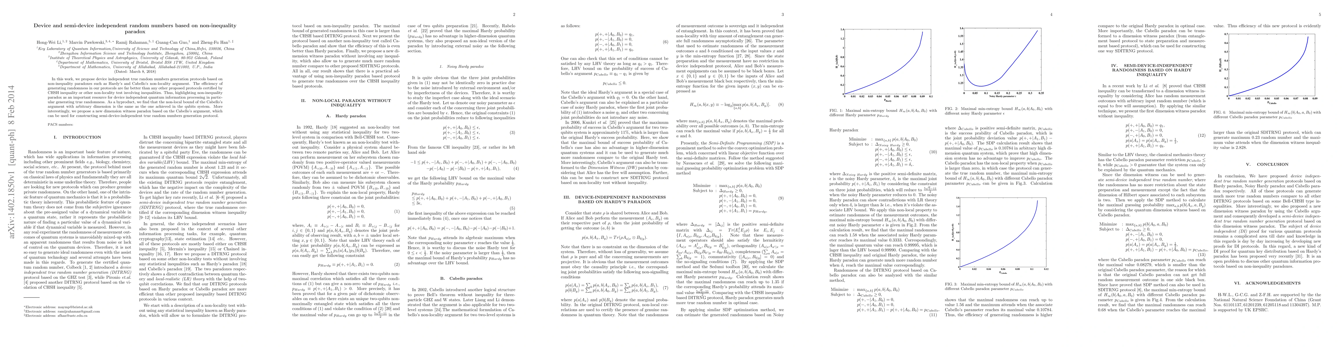 This paper proposes device-independent true random number generation protocols leveraging non-inequality paradoxes like Hardy's and Cabello's arguments, demonstrating superior efficiency compared to protocols based on CHSH inequalities. Additionally, it introduces a new dimension witness paradox for semi-device-independent random number generation.