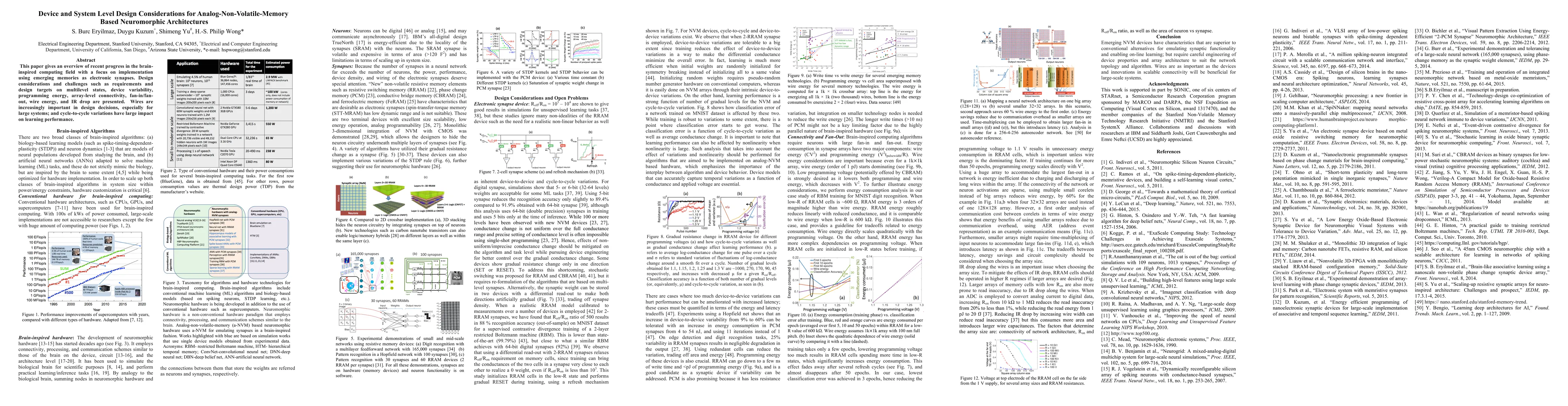 This paper gives an overview of recent progress in the brain inspired computing field with a focus on implementation using emerging memories as electronic synapses. Design considerations and challenges such as requirements and design targets on multilevel states, device variability, programming energy, array-level connectivity, fan-in/fanout, wire energy, and IR drop are presented. Wires are increasingly important in design decisions, especially for large systems, and cycle-to-cycle variations have large impact on learning performance.