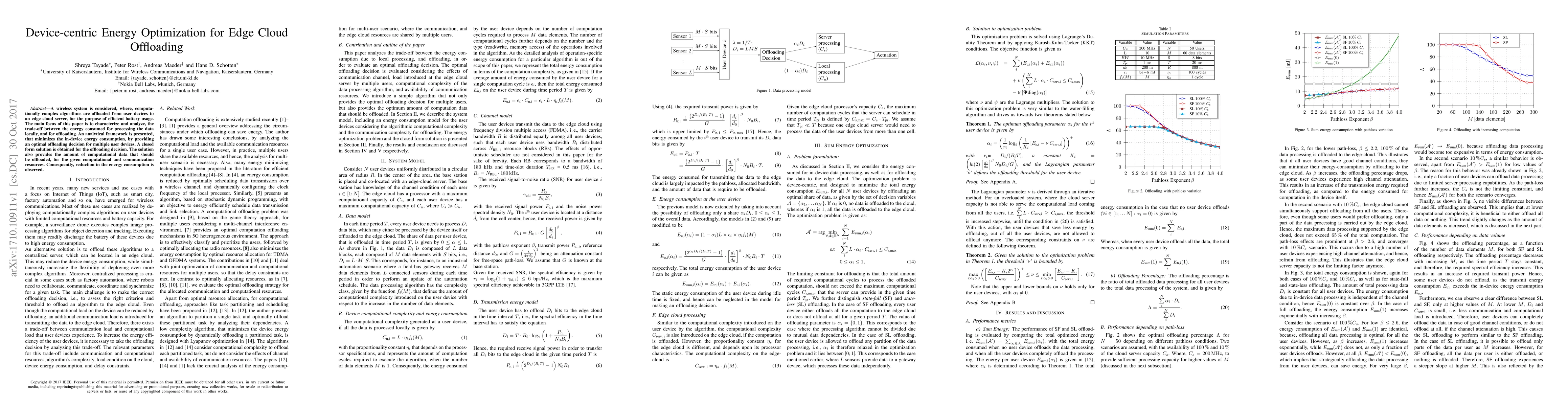 A wireless system is considered, where, computationally complex algorithms are offloaded from user devices to an edge cloud server, for the purpose of efficient battery usage. The main focus of this paper is to characterize and analyze, the trade-off between the energy consumed for processing the data locally, and for offloading. An analytical framework is presented, that minimizes the in-device energy consumption, by providing an optimal offloading decision for multiple user devices. A closed form solution is obtained for the offloading decision. The solution also provides the amount of computational data that should be offloaded, for the given computational and communication resources. Consequently, reduction in the energy consumption is observed.