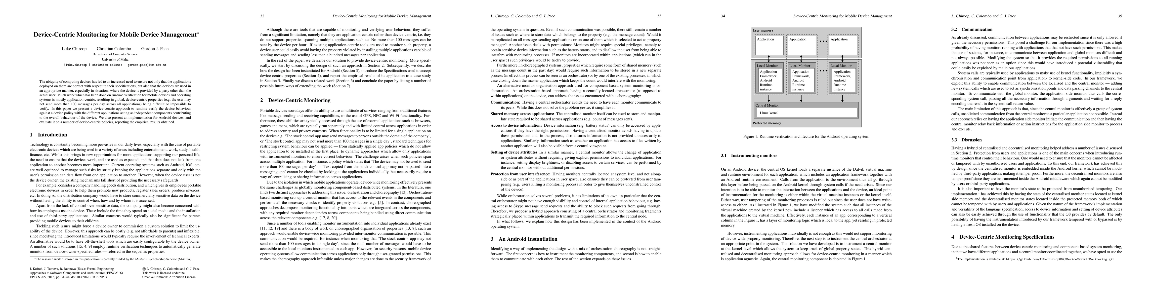 The ubiquity of computing devices has led to an increased need to ensure not only that the applications deployed on them are correct with respect to their specifications, but also that the devices are used in an appropriate manner, especially in situations where the device is provided by a party other than the actual user. Much work which has been done on runtime verification for mobile devices and operating systems is mostly application-centric, resulting in global, device-centric properties (e.g. the user may not send more than 100 messages per day across all applications) being difficult or impossible to verify. In this paper we present a device-centric approach to runtime verify the device behaviour against a device policy with the different applications acting as independent components contributing to the overall behaviour of the device. We also present an implementation for Android devices, and evaluate it on a number of device-centric policies, reporting the empirical results obtained.