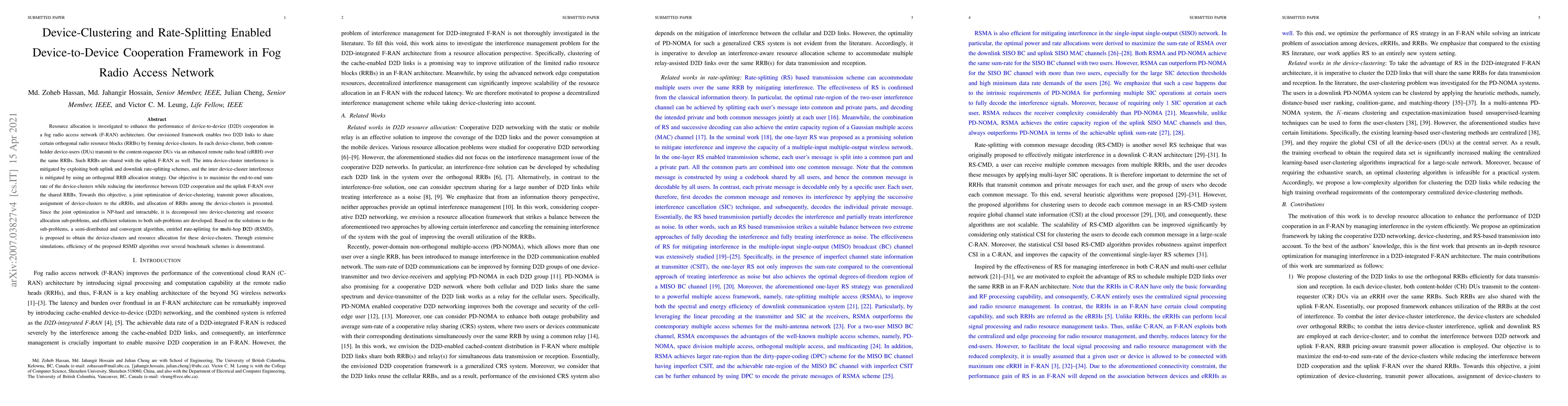 This paper proposes a device-clustering and rate-splitting framework to enhance D2D cooperation in a fog radio access network, aiming to maximize sum-rate while mitigating interference. An efficient semi-distributed algorithm, RSMD, is developed to solve the NP-hard optimization problem by decomposing it into manageable sub-problems.