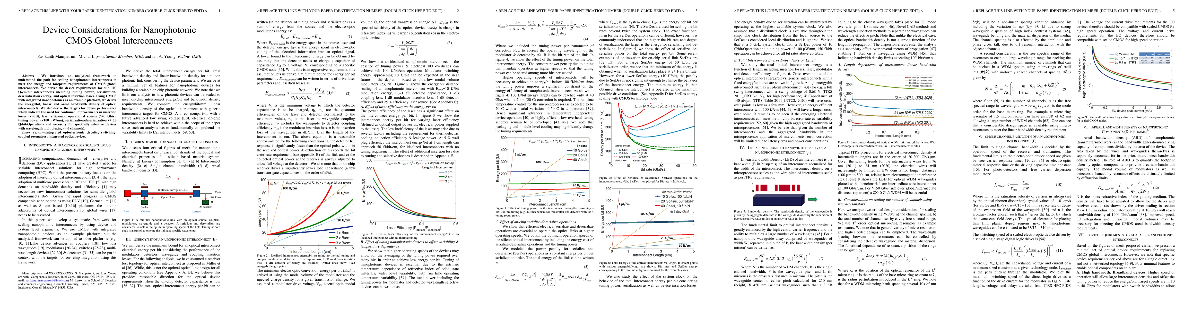 This paper introduces an analytical framework to design nanophotonic CMOS global interconnects with low energy and footprint requirements. It sets device performance targets, including reduced insertion losses, improved laser efficiency, and higher operational speeds.