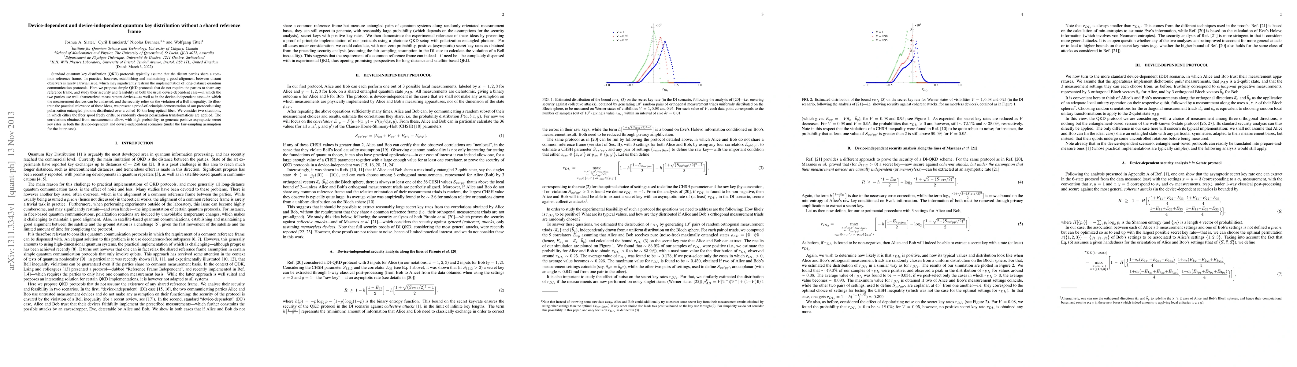 This paper proposes quantum key distribution (QKD) protocols that do not require a shared reference frame between distant parties, addressing the practical challenge of maintaining alignment. The protocols are shown to be secure and feasible in both device-dependent and device-independent scenarios, with a proof-of-principle experiment demonstrating their effectiveness over a 10-km optical fiber.