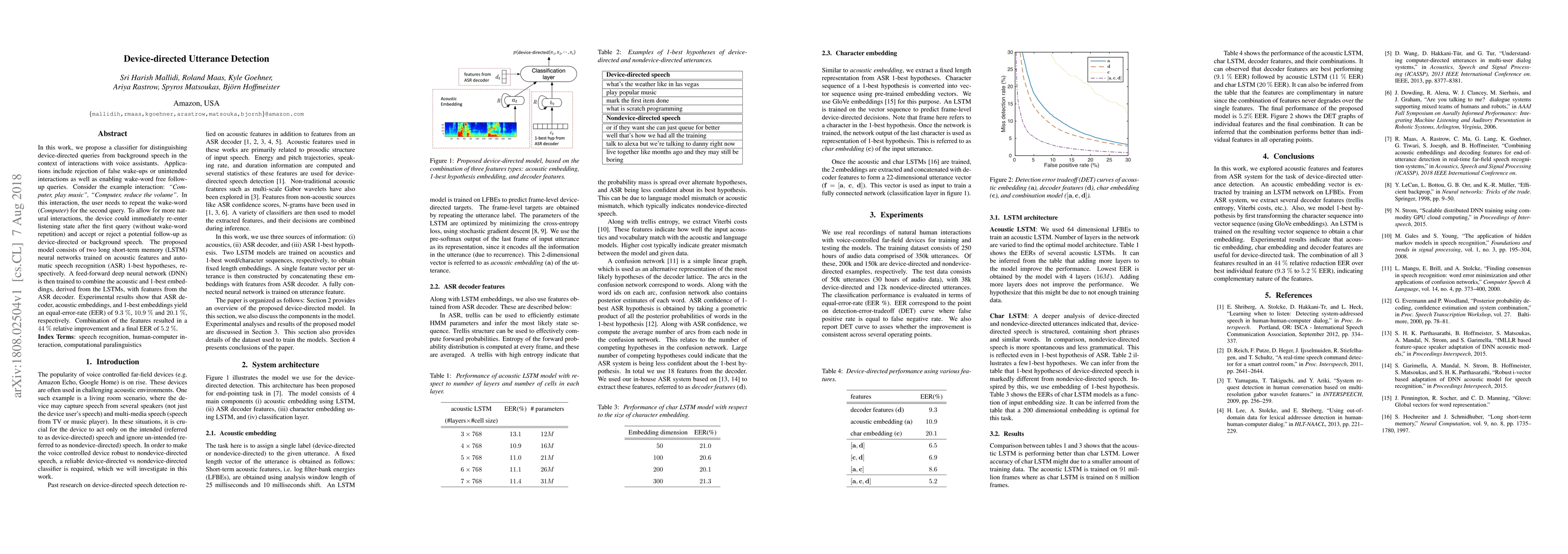 In this work, we propose a classifier for distinguishing device-directed queries from background speech in the context of interactions with voice assistants. Applications include rejection of false wake-ups or unintended interactions as well as enabling wake-word free follow-up queries. Consider the example interaction: $"Computer,~play~music", "Computer,~reduce~the~volume"$. In this interaction, the user needs to repeat the wake-word ($Computer$) for the second query. To allow for more natural interactions, the device could immediately re-enter listening state after the first query (without wake-word repetition) and accept or reject a potential follow-up as device-directed or background speech. The proposed model consists of two long short-term memory (LSTM) neural networks trained on acoustic features and automatic speech recognition (ASR) 1-best hypotheses, respectively. A feed-forward deep neural network (DNN) is then trained to combine the acoustic and 1-best embeddings, derived from the LSTMs, with features from the ASR decoder. Experimental results show that ASR decoder, acoustic embeddings, and 1-best embeddings yield an equal-error-rate (EER) of $9.3~\%$, $10.9~\%$ and $20.1~\%$, respectively. Combination of the features resulted in a $44~\%$ relative improvement and a final EER of $5.2~\%$.
