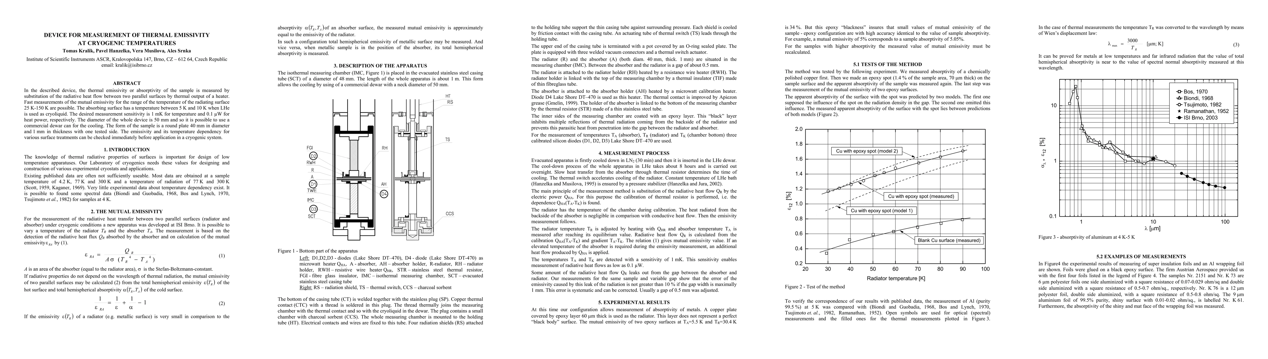 The research presents a compact device for measuring thermal emissivity at cryogenic temperatures (25 K - 150 K), achieving a sensitivity of 1 mK for temperature and 0.1 μW for heat power. The device uses a heater to replace radiative heat flow, allowing fast measurements with a sample in the form of a 40 mm diameter, 1 mm thick round plate cooled to 5-10 K using liquid helium.
