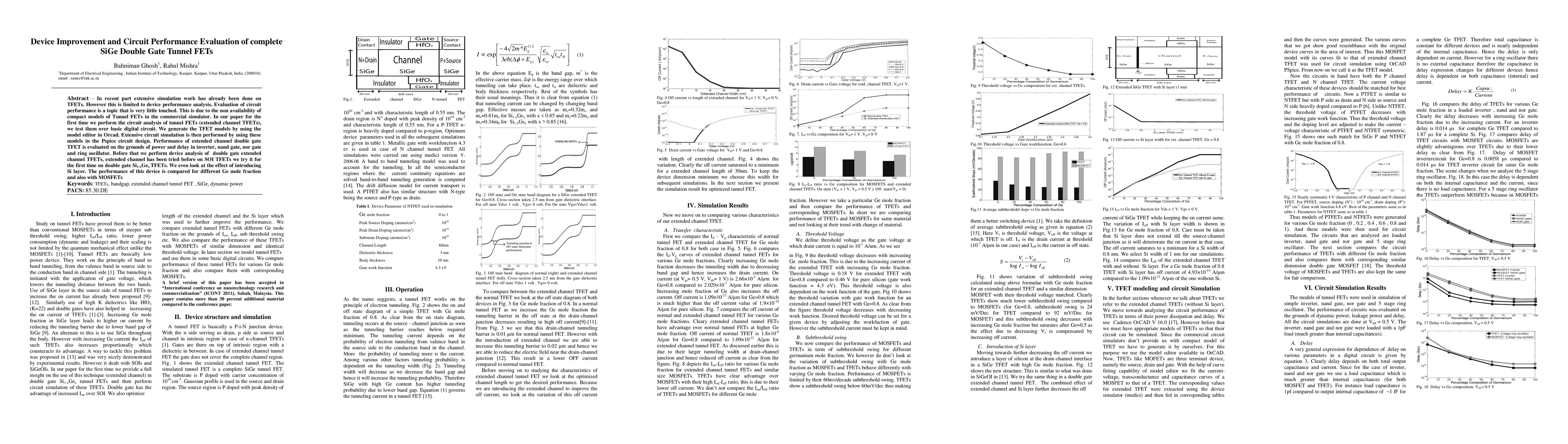 In recent part extensive simulation work has already been done on TFETs. However this is limited to device performance analysis. Evaluation of circuit performance is a topic that is very little touched. This is due to the non availability of compact models of Tunnel FETs in the commercial simulator. In our paper for the first time we perform the circuit analysis of tunnel FETs (extended channel TFETs), we test them over basic digital circuit. We generate the TFET models by using the model editor in Orcad. Extensive circuit simulation is then performed by using these models in the Pspice circuit design. Performance of extended channel double gate TFET is evaluated on the grounds of power and delay in inverter, nand gate, nor gate and ring oscillator. Before that we perform device analysis of double gate extended channel TFETs, extended channel has been tried before on SOI TFETs we try it for the first time on double gate Si1-xGex TFETs. We even look at the effect of introducing Si layer. The performance of this device is compared for different Ge mole fraction and also with MOSFETs