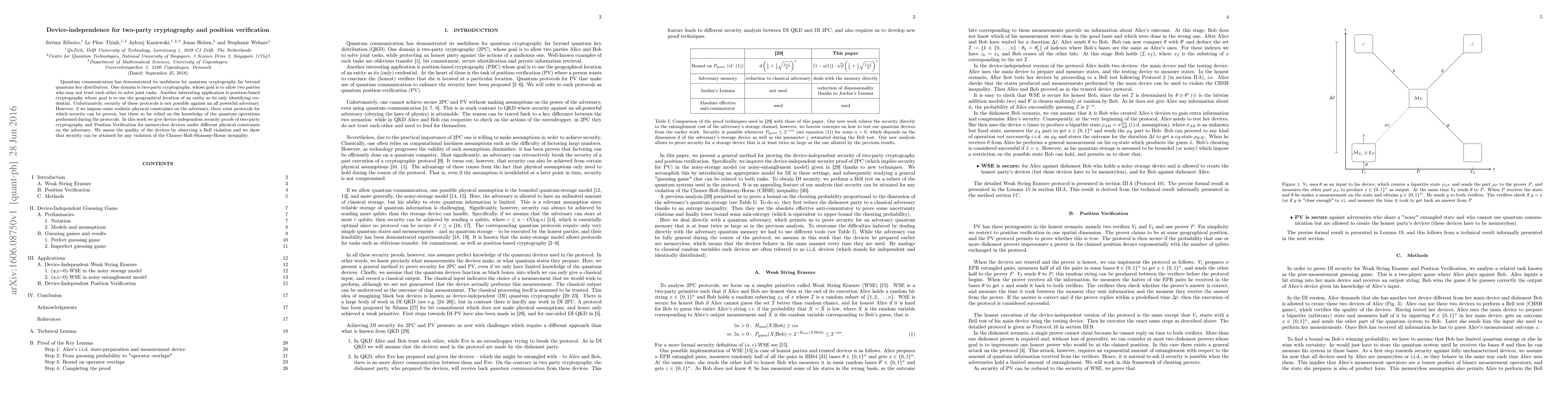 This paper presents device-independent security proofs for two-party cryptography and position verification using memoryless quantum devices, ensuring security under realistic physical constraints on adversaries, and demonstrates security through Bell inequality violations.