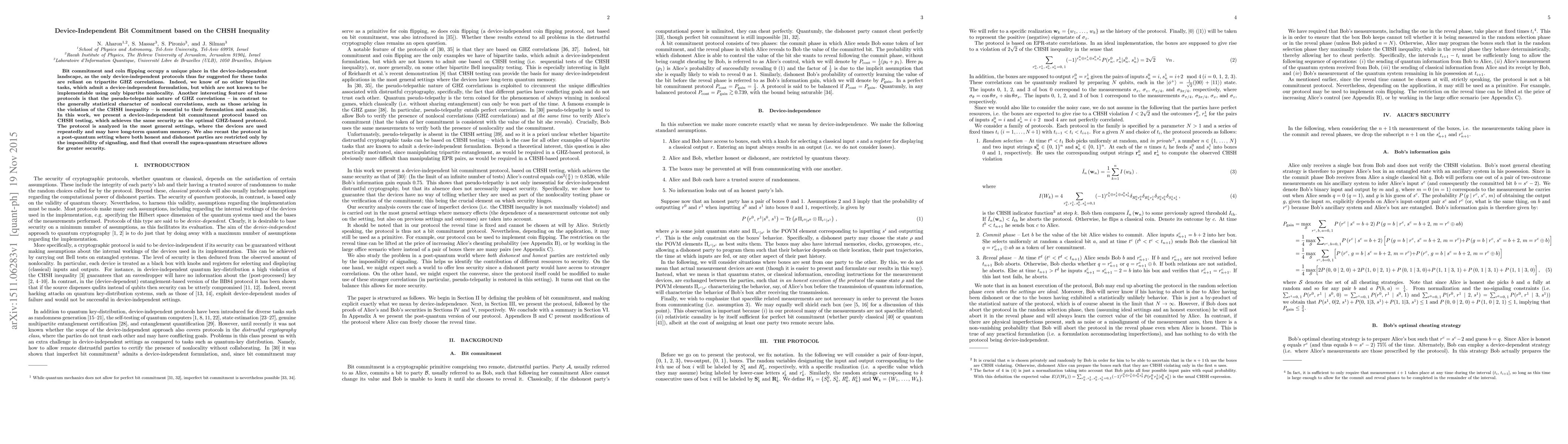 This paper presents a device-independent bit commitment protocol based on the CHSH inequality, achieving the same security as the optimal GHZ-based protocol. It analyzes the protocol in general settings with quantum memory and also explores its post-quantum security, finding enhanced security in the supra-quantum structure.