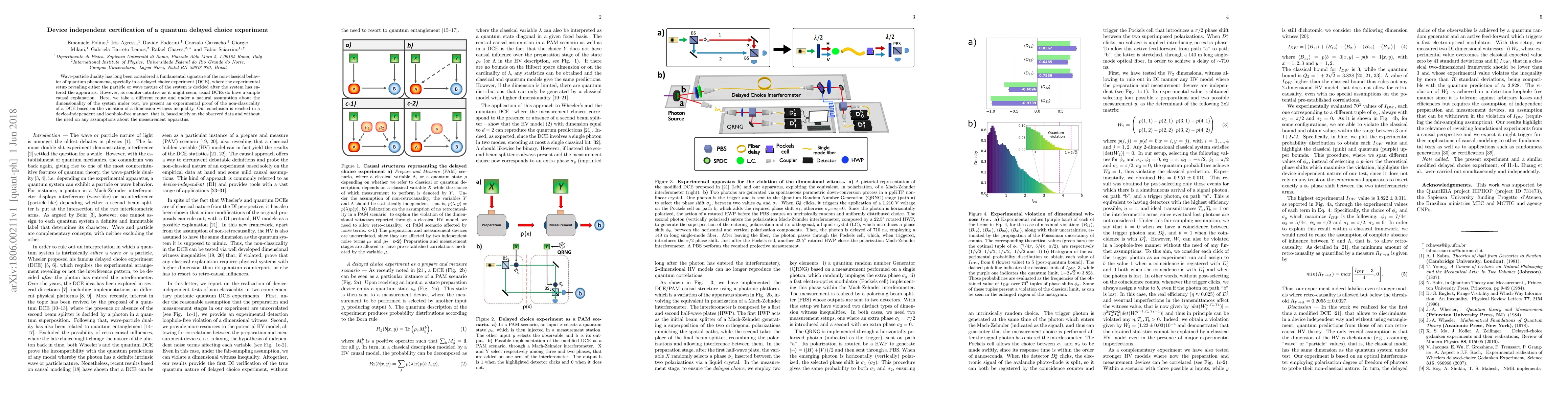 This paper presents a device-independent, loophole-free experiment to certify the non-classical nature of a quantum delayed choice experiment, demonstrating wave-particle duality through the violation of a dimension witness inequality without relying on assumptions about measurement apparatuses.