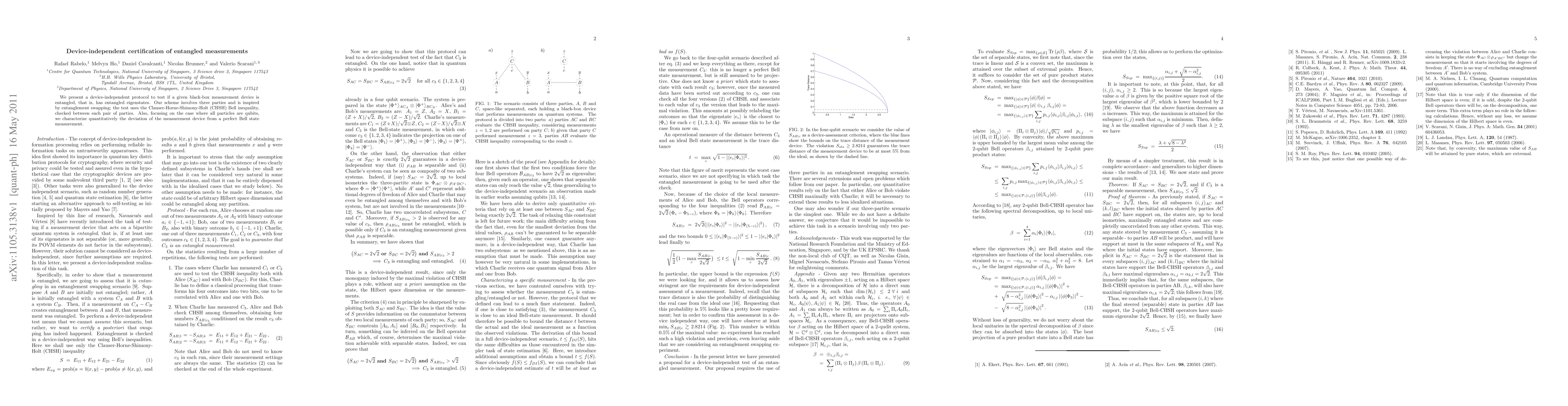 A device-independent protocol tests if a measurement device is entangled using three parties and the Clauser-Horne-Shimony-Holt Bell inequality. The test characterizes the deviation of real-world devices from perfect Bell state measurements.