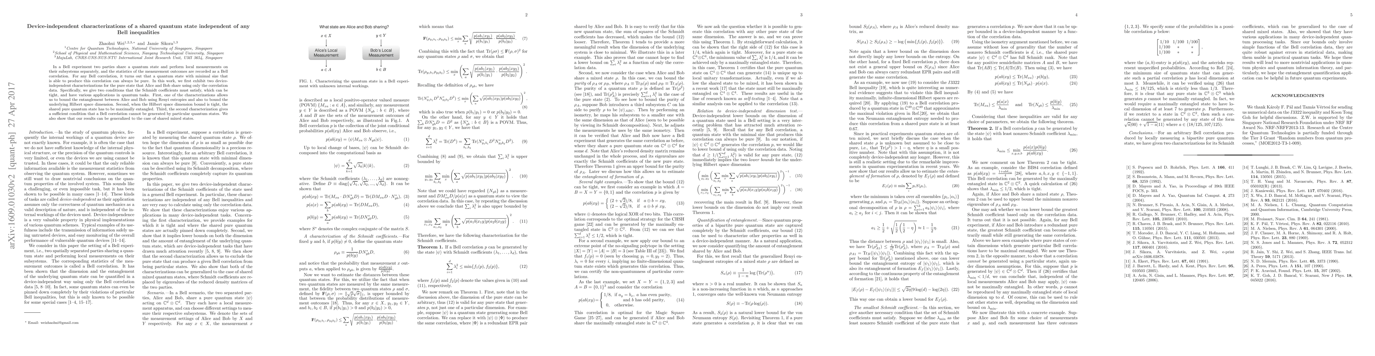 This paper presents two device-independent characterizations for pure quantum states shared between Alice and Bob, derived solely from Bell correlation data. These characterizations provide conditions on Schmidt coefficients, enabling bounds on entanglement and Hilbert space dimension, and identifying maximally entangled states.