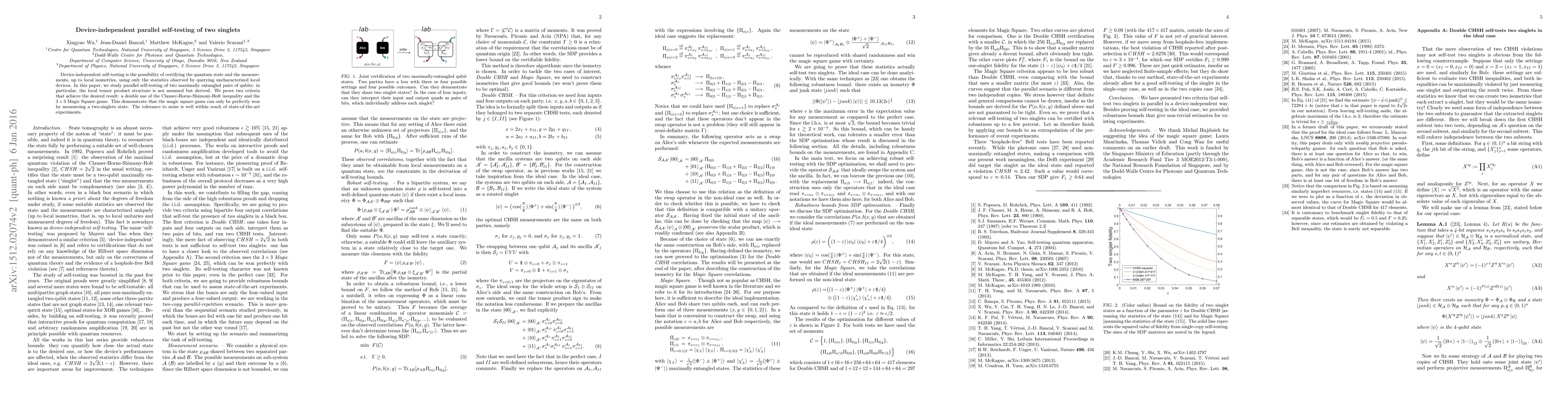 Device-independent self-testing is the possibility of certifying the quantum state and the measurements, up to local isometries, using only the statistics observed by querying uncharacterized local devices. In this paper, we study parallel self-testing of two maximally entangled pairs of qubits: in particular, the local tensor product structure is not assumed but derived. We prove two criteria that achieve the desired result: a double use of the Clauser-Horne-Shimony-Holt inequality and the $3\times 3$ Magic Square game. This demonstrate that the magic square game can only be perfectly won by measureing a two-singlets state. The tolerance to noise is well within reach of state-of-the-art experiments.