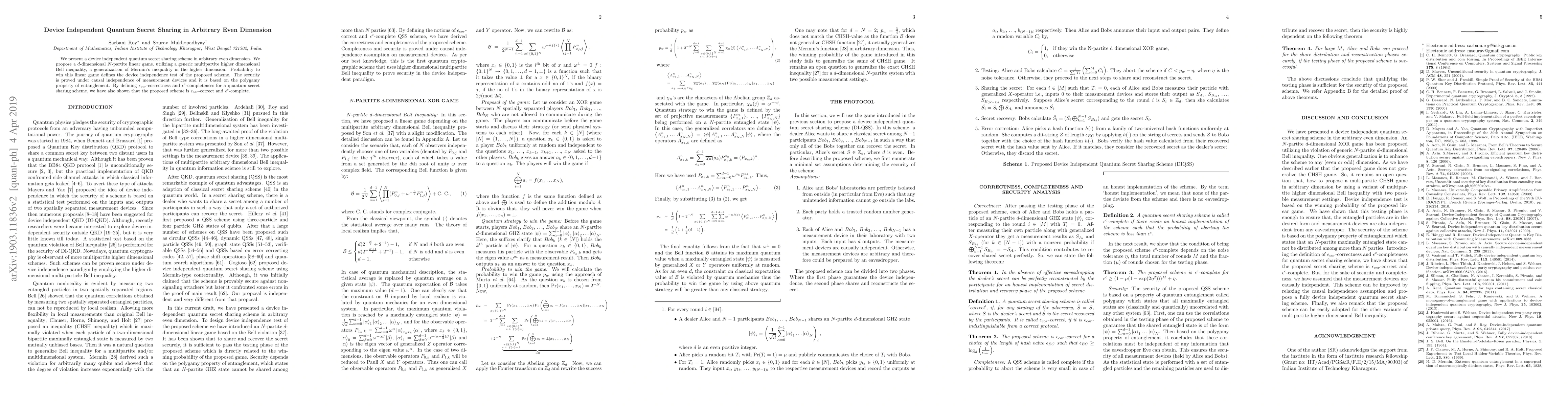 This paper proposes a device independent quantum secret sharing scheme in even dimensions, utilizing a generalized higher-dimensional Bell inequality. The security relies on the polygamy property of entanglement and the scheme's correctness and completeness are defined by $\epsilon_{cor}$-correctness and $\epsilon^c$-completeness.
