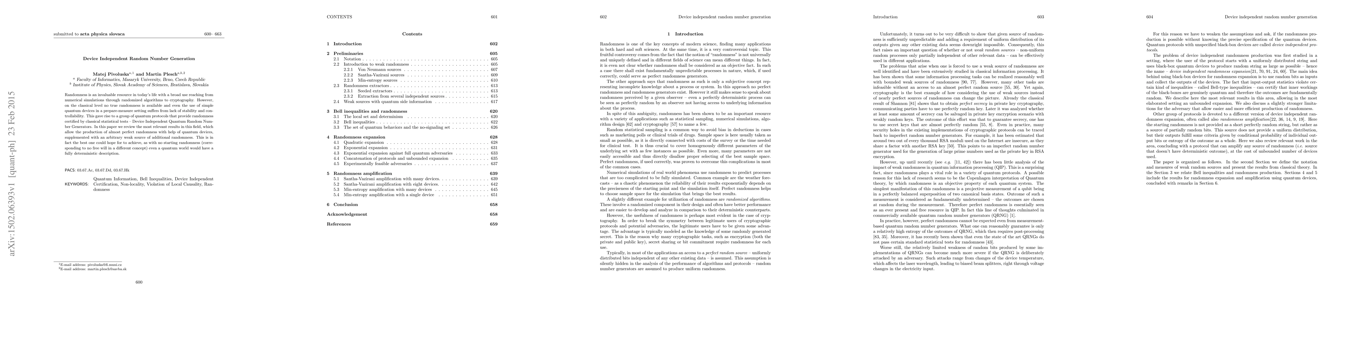 The paper reviews Device Independent Quantum Random Number Generators (DIQRNGs) which produce almost perfect randomness using quantum devices and an arbitrary weak source of additional randomness.