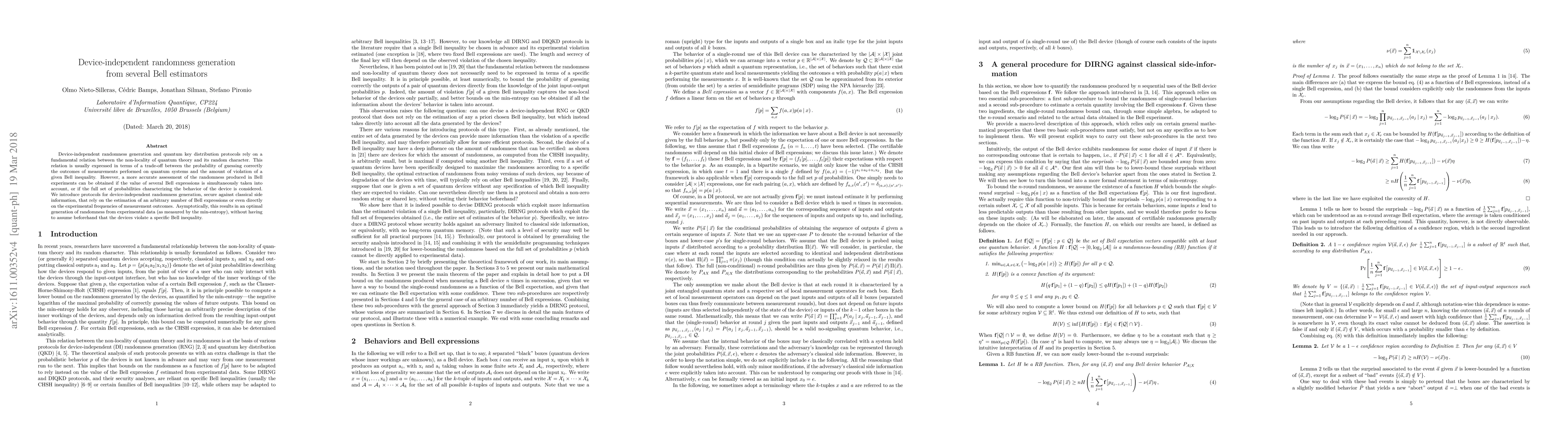 This paper proposes protocols for device-independent randomness generation that leverage multiple Bell estimators or measurement outcome frequencies, ensuring security against classical side information. It achieves optimal randomness generation based on min-entropy, without requiring prior knowledge of Bell inequality violations.