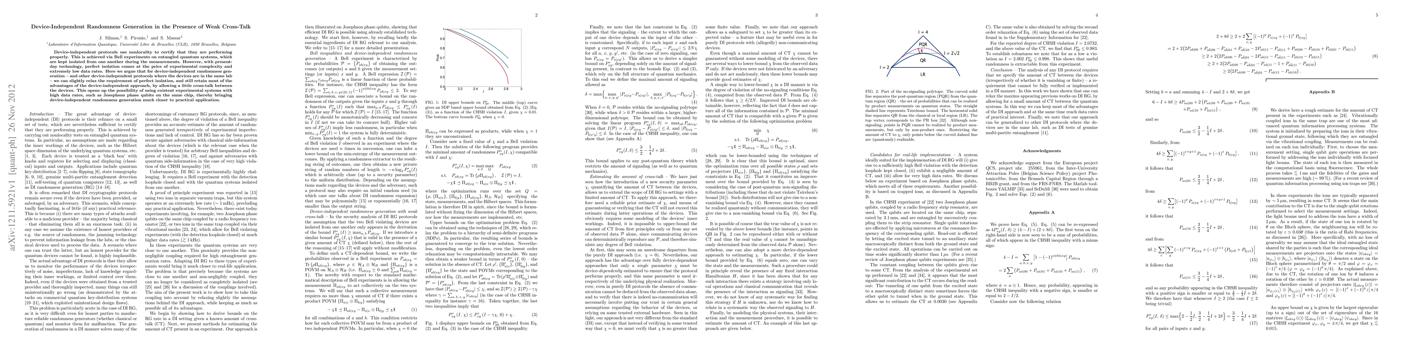 Device-independent protocols use nonlocality to certify that they are performing properly. This is achieved via Bell experiments on entangled quantum systems, which are kept isolated from one another during the measurements. However, with present-day technology, perfect isolation comes at the price of experimental complexity and extremely low data rates. Here we argue that for device-independent randomness generation -- and other device-independent protocols where the devices are in the same lab -- we can slightly relax the requirement of perfect isolation, and still retain most of the advantages of the device-independent approach, by allowing a little cross-talk between the devices. This opens up the possibility of using existent experimental systems with high data rates, such as Josephson phase qubits on the same chip, thereby bringing device-independent randomness generation much closer to practical application.