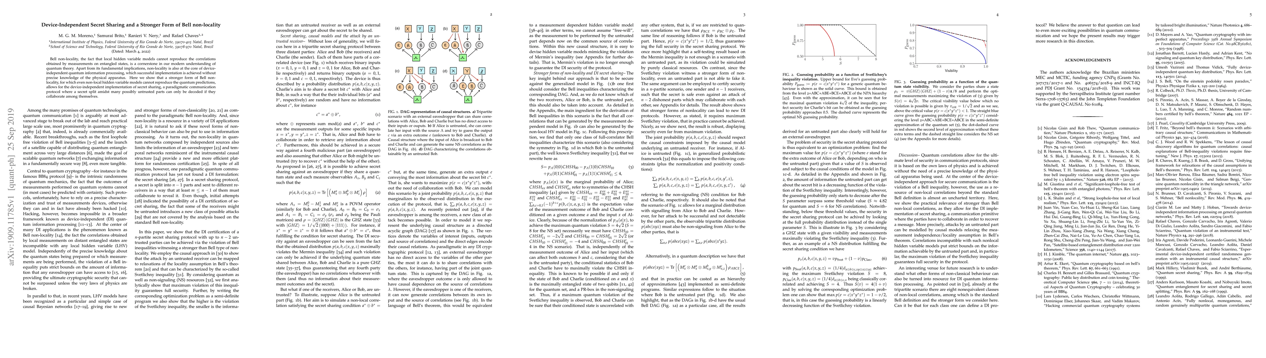 Bell nonlocality, the fact that local hidden variable models cannot reproduce the correlations obtained by measurements on entangled states, is a cornerstone in our modern understanding of quantum theory. Apart from its fundamental implications, nonlocality is also at the core of device-independent quantum information processing, which successful implementation is achieved without precise knowledge of the physical apparatus. Here we show that a stronger form of Bell nonlocality, for which even nonlocal hidden variable models cannot reproduce the quantum predictions, allows for the device-independent implementation of secret sharing, a paradigmatic communication protocol where a secret split amidst many possibly untrusted parts can only be decoded if they collaborate among themselves.