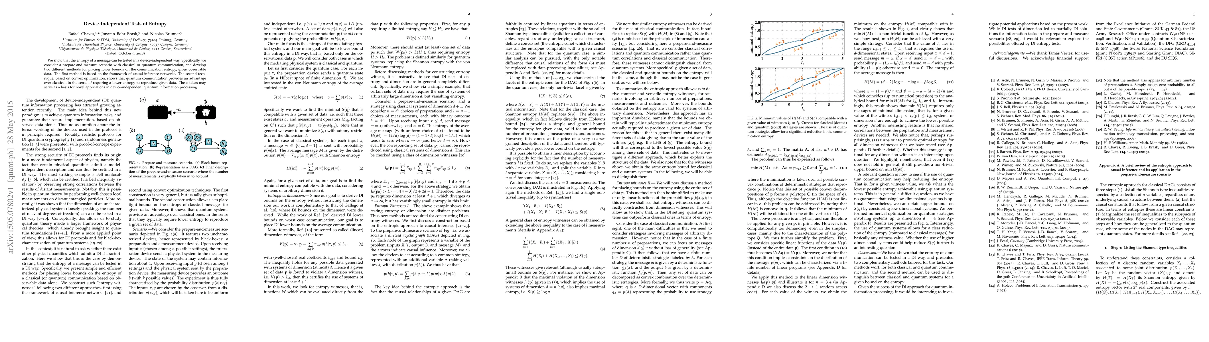 This paper presents device-independent methods for testing message entropy, utilizing causal inference networks and convex optimization. It demonstrates that quantum communication requires less entropy than classical communication to reproduce given data, potentially paving the way for new applications in device-independent quantum information processing.