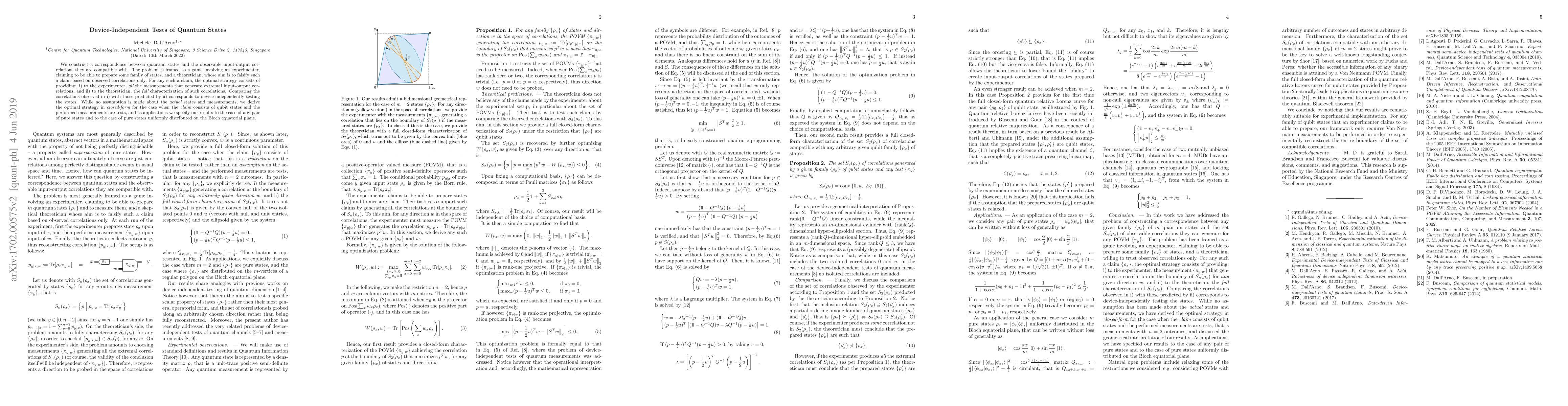 We construct a correspondence between quantum states and the observable input-output correlations they are compatible with. The problem is framed as a game involving an experimenter, claiming to be able to prepare some family of states, and a theoretician, whose aim is to falsify such a claim based on observed correlations only. For any such a claim, the optimal strategy consists of providing: i) to the experimenter, all the measurements that generate extremal input-output correlations, and ii) to the theoretician, the full characterization of such correlations. Comparing the correlations observed in i) with those predicted by ii) corresponds to device-independently testing the states. While no assumption is made about the actual states and measurements, we derive the optimal strategy in closed-form for the case when the claim consists of qubit states and the performed measurements are tests, and as applications we specify our results to the case of any pair of pure states and to the case of pure states uniformly distributed on the Bloch equatorial plane.