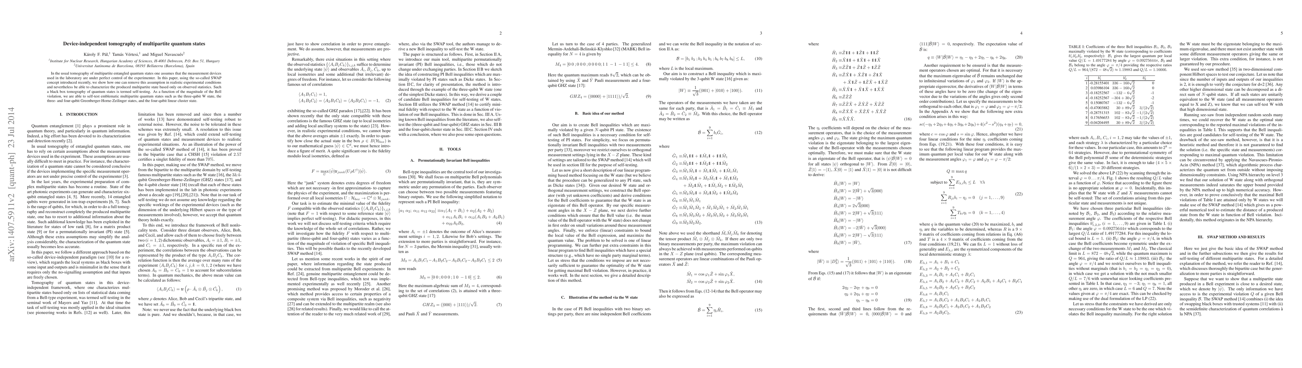 This paper presents a method for device-independent tomography of multipartite quantum states, enabling characterization without assuming perfect control over measurement devices. Using the SWAP concept, it demonstrates self-testing of quantum states like the three-qubit W state and Greenberger-Horne-Zeilinger states based solely on observed statistics.
