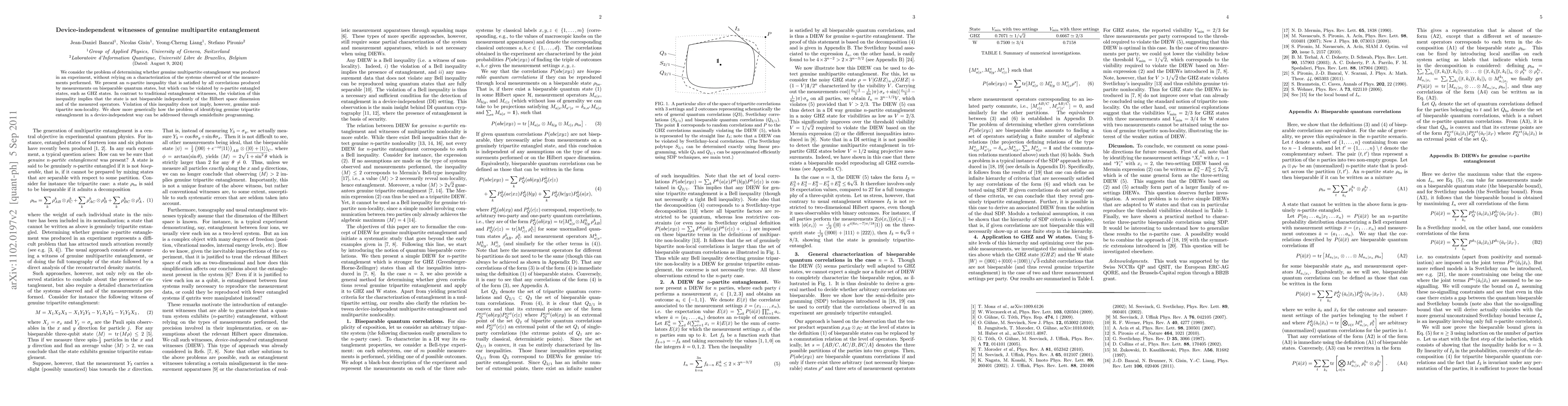 We consider the problem of determining whether genuine multipartite entanglement was produced in an experiment, without relying on a characterization of the systems observed or of the measurements performed. We present an n-partite inequality that is satisfied by all correlations produced by measurements on biseparable quantum states, but which can be violated by n-partite entangled states, such as GHZ states. In contrast to traditional entanglement witnesses, the violation of this inequality implies that the state is not biseparable independently of the Hilbert space dimension and of the measured operators. Violation of this inequality does not imply, however, genuine multipartite non-locality. We show more generically how the problem of identifying genuine tripartite entanglement in a device-independent way can be addressed through semidefinite programming.
