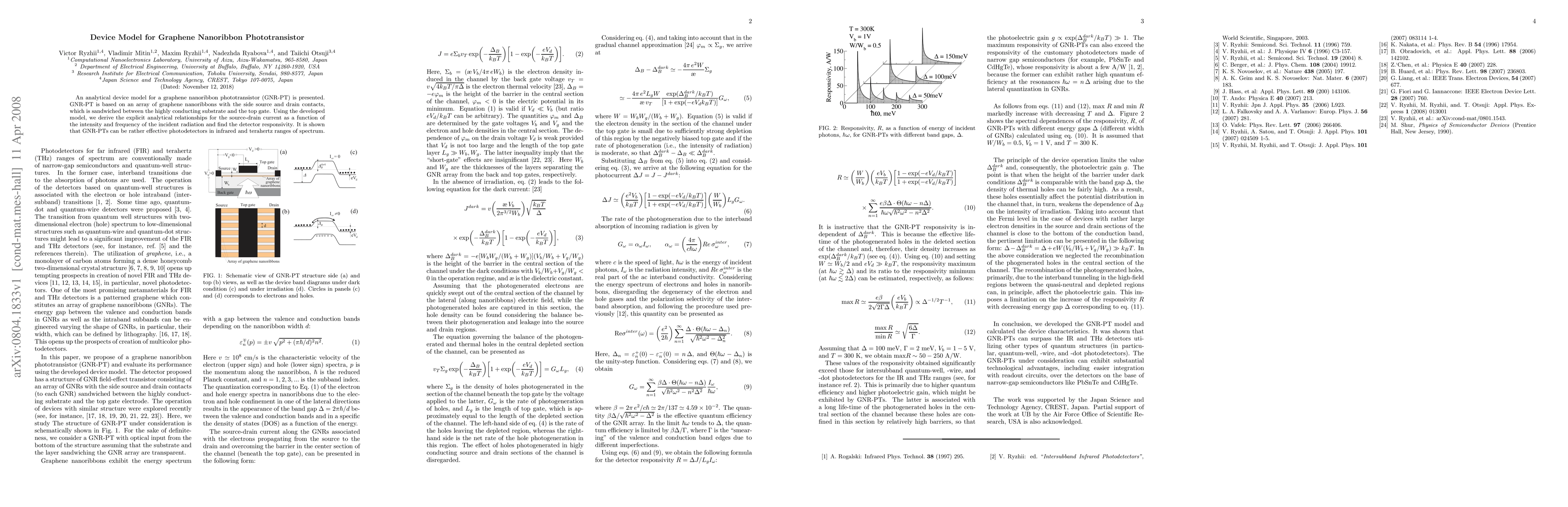 The paper presents an analytical device model for graphene nanoribbon phototransistors (GNR-PT), showing their effectiveness as photodetectors in infrared and terahertz ranges, with derived relationships for source-drain current based on incident radiation intensity and frequency.
