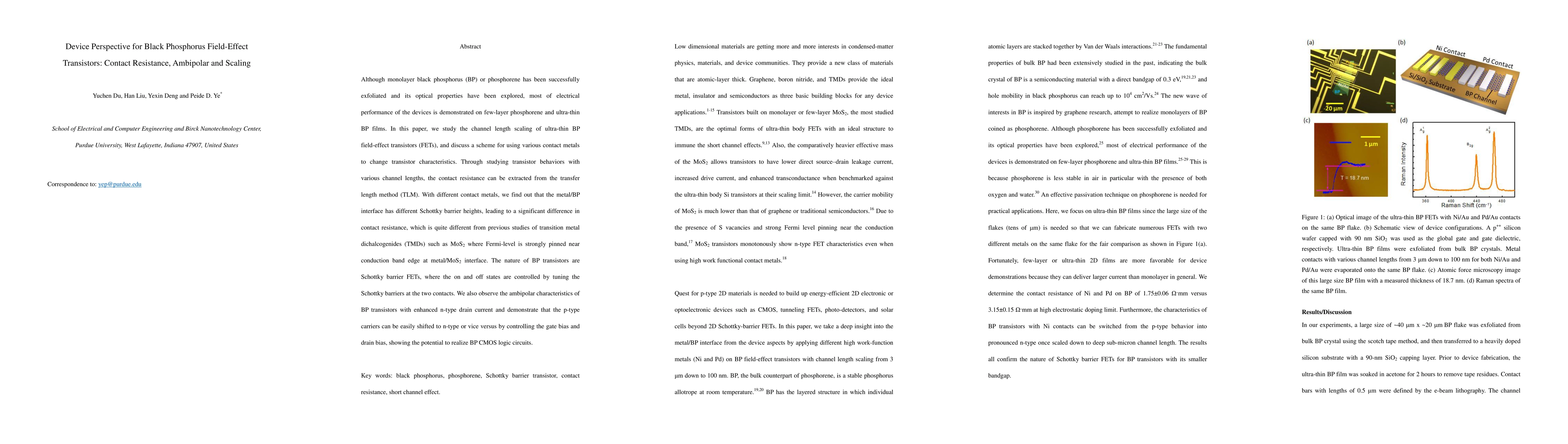 This paper investigates the electrical performance and scaling of ultra-thin black phosphorus field-effect transistors, focusing on contact resistance and ambipolar behavior. It finds that the metal/BP interface exhibits varying Schottky barrier heights, influencing contact resistance and differing from TMDs like MoS2. The study also highlights the potential for realizing black phosphorus CMOS logic circuits through ambipolar characteristics.