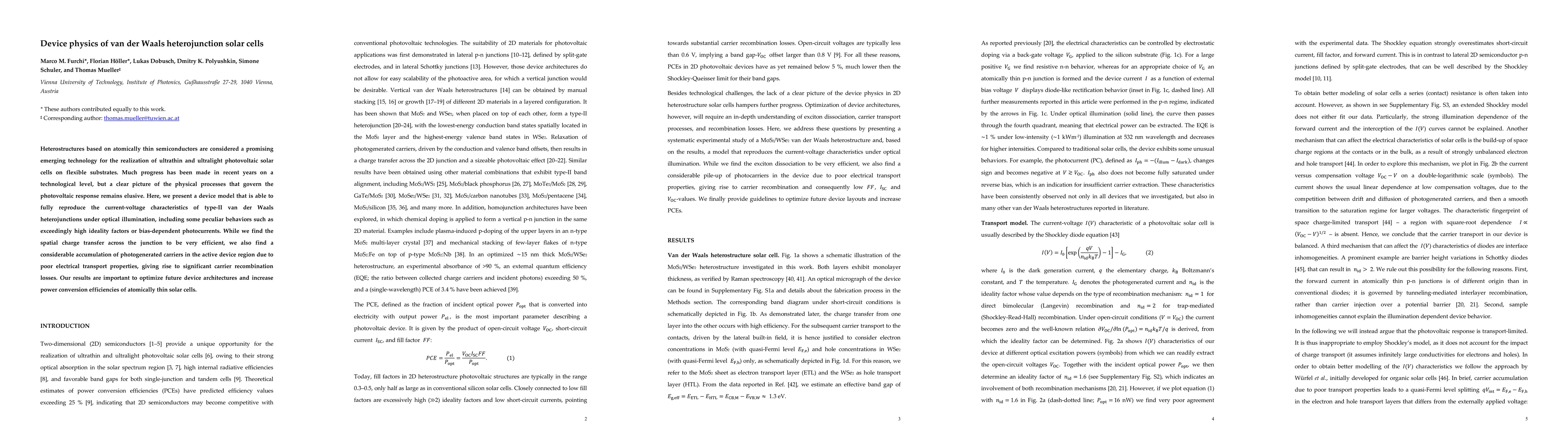 Heterostructures based on atomically thin semiconductors are considered a promising emerging technology for the realization of ultrathin and ultralight photovoltaic solar cells on flexible substrates. Much progress has been made in recent years on a technological level, but a clear picture of the physical processes that govern the photovoltaic response remains elusive. Here, we present a device model that is able to fully reproduce the current-voltage characteristics of type-II van der Waals heterojunctions under optical illumination, including some peculiar behaviors such as exceedingly high ideality factors or bias-dependent photocurrents. While we find the spatial charge transfer across the junction to be very efficient, we also find a considerable accumulation of photogenerated carriers in the active device region due to poor electrical transport properties, giving rise to significant carrier recombination losses. Our results are important to optimize future device architectures and increase power conversion efficiencies of atomically thin solar cells.