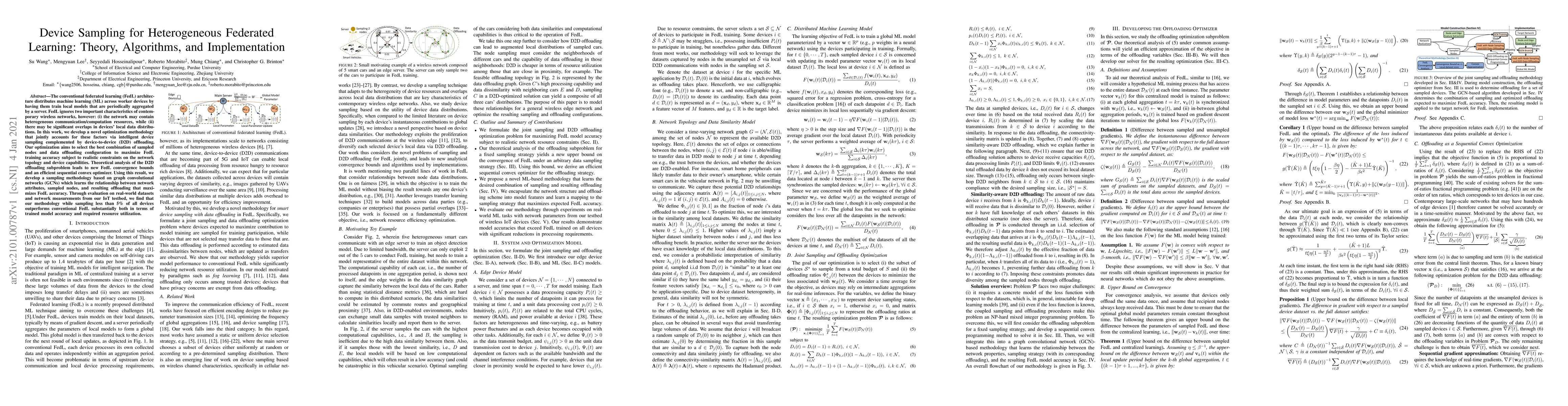 This paper proposes a novel optimization methodology for heterogeneous federated learning that intelligently samples devices and employs device-to-device offloading to maximize training accuracy, addressing the challenges of resource heterogeneity and data distribution overlaps. The approach leverages graph convolutional networks to learn optimal sampling and offloading strategies, achieving superior performance with minimal device involvement.