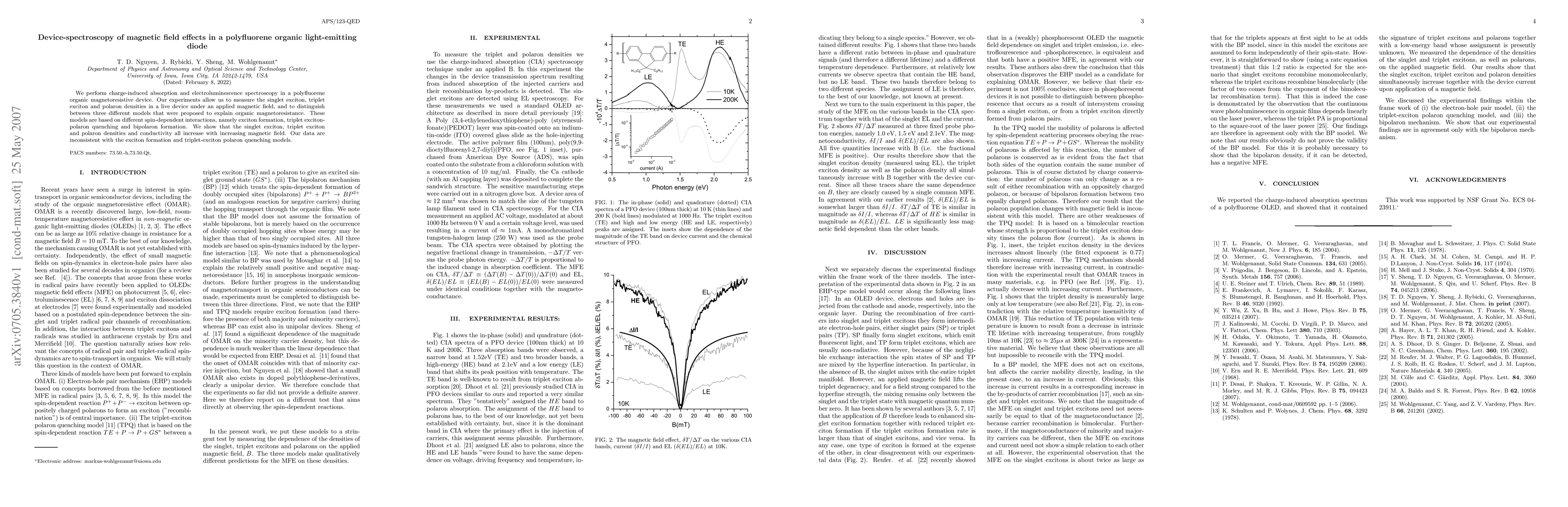 This study uses spectroscopy to analyze the effects of magnetic fields on a polyfluorene organic light-emitting diode, finding that singlet and triplet exciton, and polaron densities increase with magnetic field. The results contradict models based on exciton formation and triplet-exciton polaron quenching, favoring the bipolaron formation model.