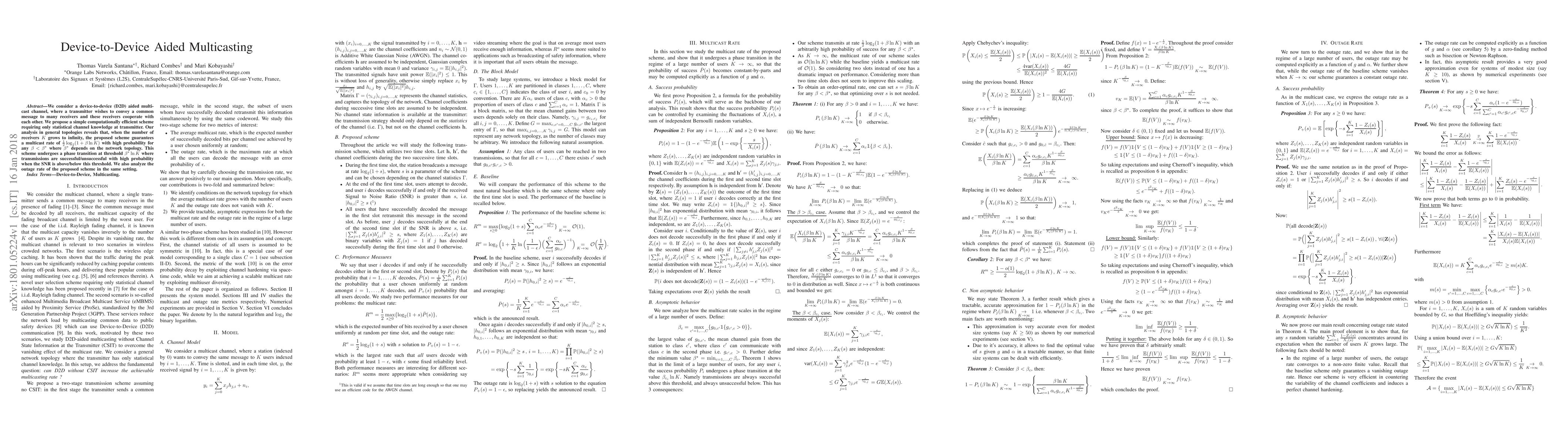 We consider a device-to-device (D2D) aided multicast channel, where a transmitter wishes to convey a common message to many receivers and these receivers cooperate with each other. We propose a simple computationally efficient scheme requiring only statistical channel knowledge at transmitter. Our analysis in general topologies reveals that, when the number of receivers $K$ grows to infinity, the proposed scheme guarantees a multicast rate of ${1 \over 2} \log_2(1 + \beta \ln K )$ with high probability for any $\beta < \beta^\star$ where $\beta^\star$ depends on the network topology. This scheme undergoes a phase transition at threshold $\beta^\star \ln K$ where transmissions are successful/unsuccessful with high probability when the SNR is above/below this threshold. We also analyze the outage rate of the proposed scheme in the same setting.