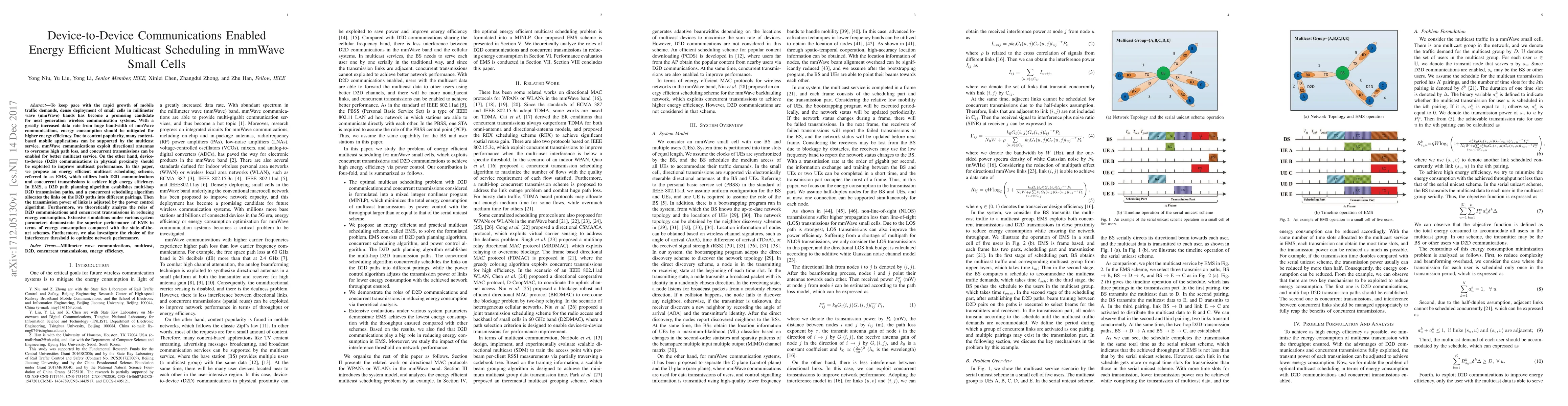 The paper proposes an energy-efficient multicast scheduling scheme (EMS) for mmWave small cells, utilizing both device-to-device (D2D) communications and concurrent transmissions. EMS includes a D2D path planning algorithm, a concurrent scheduling algorithm, and a power control algorithm.