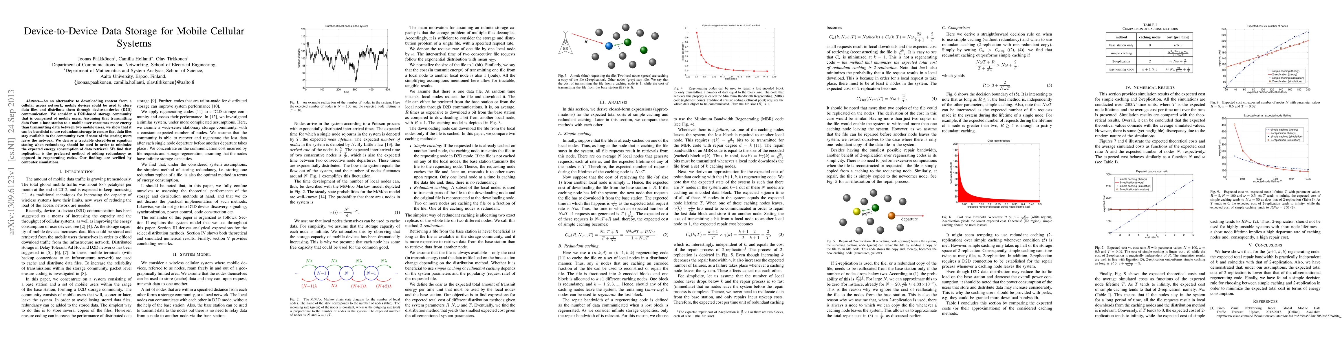 This paper proposes a device-to-device (D2D) data storage method for mobile cellular systems, demonstrating that redundant storage among mobile users can minimize energy consumption compared to traditional base station downloads. The study derives a closed-form equation for optimal redundancy use and finds replication to be more efficient than regenerating codes, verified by simulations.