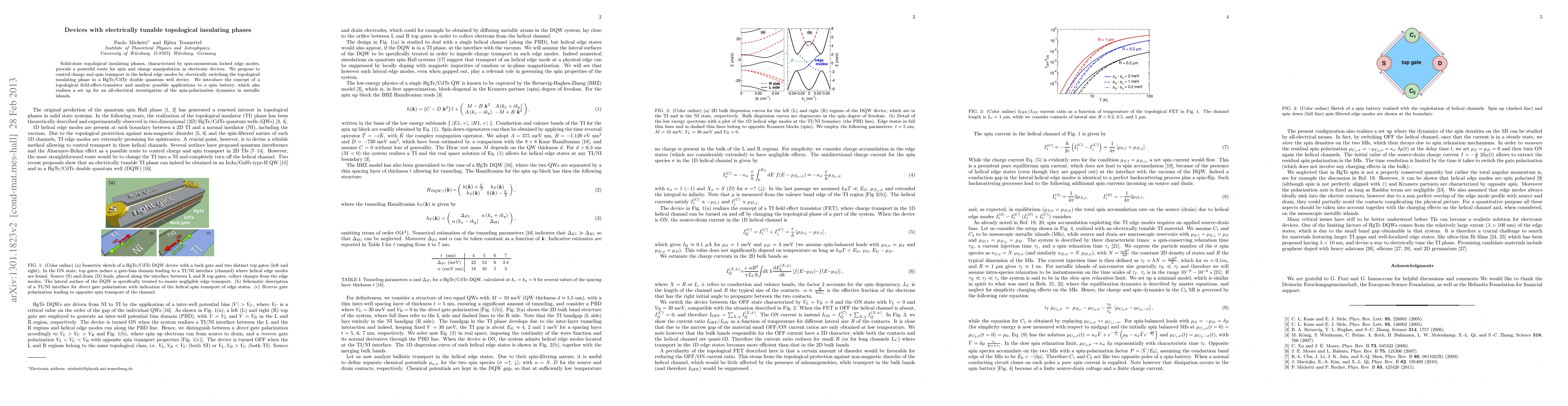 This paper proposes an electrically tunable topological insulating phase in a HgTe/CdTe double quantum well device using a topological field-effect-transistor, enabling control over spin and charge transport in helical edge modes, with potential applications in spin batteries and spin-polarization dynamics studies.