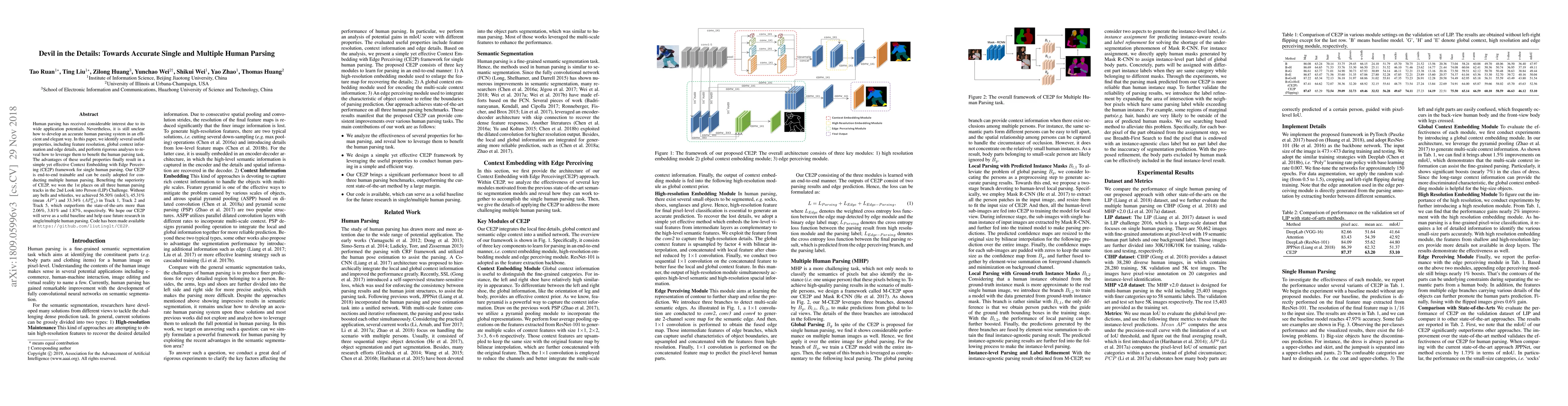 This paper proposes a Context Embedding with Edge Perceiving (CE2P) framework for accurate single and multiple human parsing, leveraging feature resolution, global context, and edge details. The CE2P framework achieved top results on three benchmarks, outperforming state-of-the-art methods by significant margins, and aims to serve as a solid baseline for future research.
