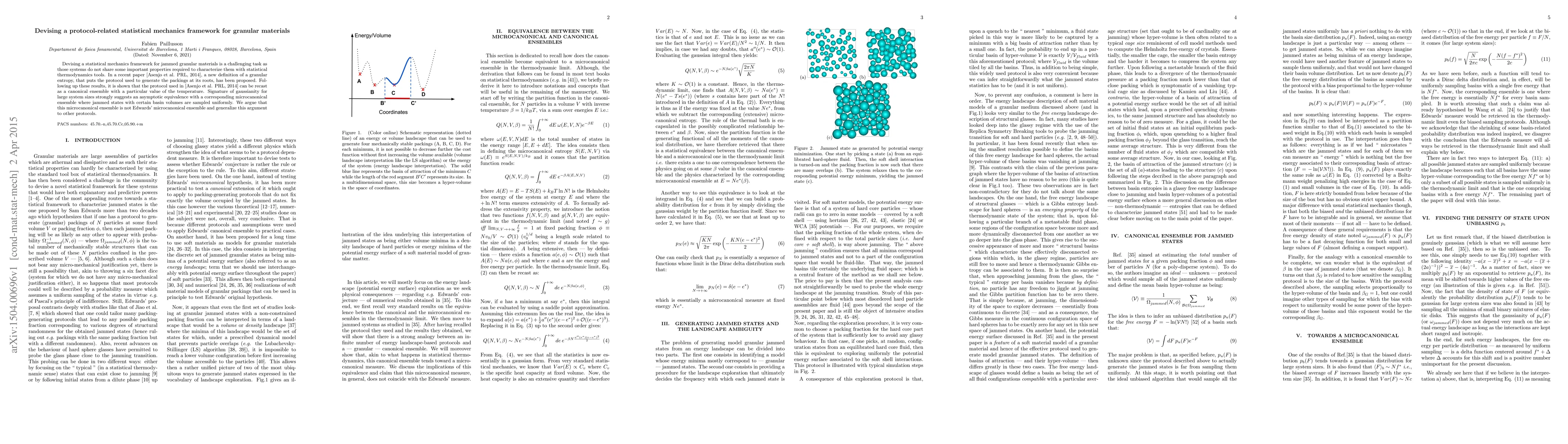 Devising a statistical mechanics framework for jammed granular materials is a challenging task as those systems do not share some important properties required to characterize them with statistical thermodynamics tools. In a recent paper [Asenjo et al. PRL, 2014], a new definition of a granular entropy, that puts the protocol used to generate the packings at its roots, has been proposed. Following up these results, it is shown that the protocol used in [Asenjo et al. PRL, 2014] can be recast as a canonical ensemble with a particular value of the temperature. Signature of gaussianity for large system sizes strongly suggests an asymptotic equivalence with a corresponding microcanonical ensemble where jammed states with certain basin volumes are sampled uniformly. We argue that this microcanonical ensemble is not Edwards' microcanonical ensemble and generalize this argument to other protocols.