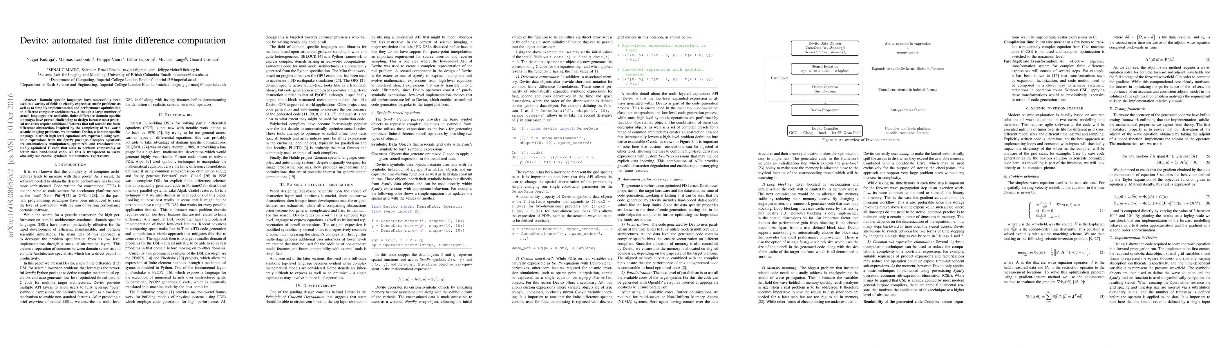 Devito is a domain-specific language for automated fast finite difference computation, leveraging symbolic expressions from SymPy to simplify complex equation manipulation and optimization, translating into highly optimized C code. Users benefit from concise mathematical expressions without needing to manage low-level code details.