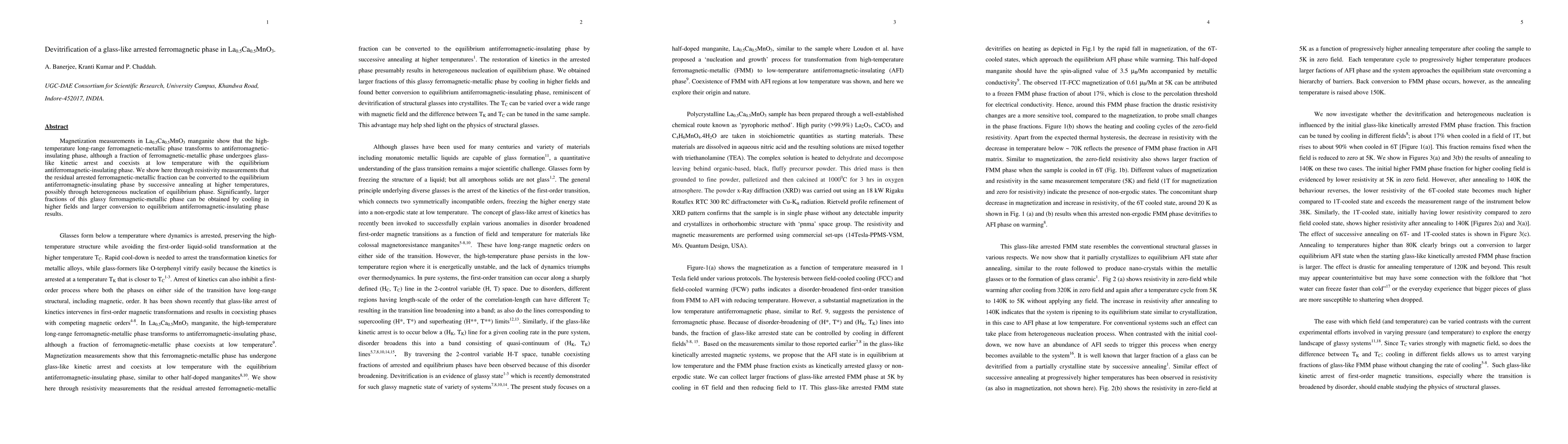 The research paper investigates La0.5Ca0.5MnO3 manganite, revealing that a fraction of its ferromagnetic-metallic phase becomes glass-like and arrested at high temperatures, coexisting with the equilibrium antiferromagnetic-insulating phase. Resistivity measurements demonstrate that this arrested phase can transition to the equilibrium phase via annealing at higher temperatures, likely through phase nucleation. Enhanced field cooling and larger annealing temperatures increase the arrested phase fraction and its conversion to the equilibrium phase.