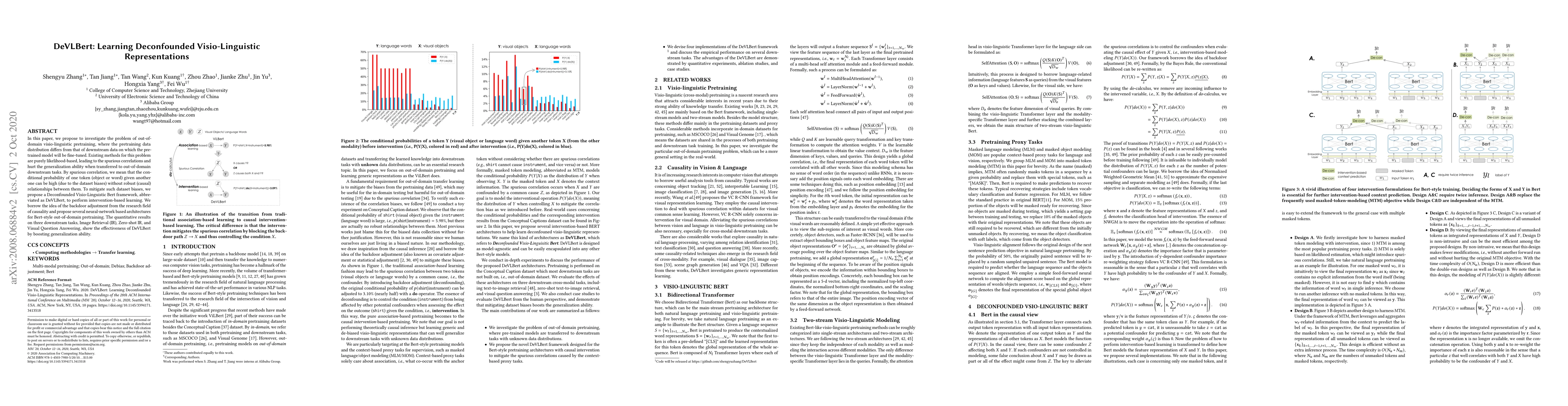 In this paper, we propose to investigate the problem of out-of-domain visio-linguistic pretraining, where the pretraining data distribution differs from that of downstream data on which the pretrained model will be fine-tuned. Existing methods for this problem are purely likelihood-based, leading to the spurious correlations and hurt the generalization ability when transferred to out-of-domain downstream tasks. By spurious correlation, we mean that the conditional probability of one token (object or word) given another one can be high (due to the dataset biases) without robust (causal) relationships between them. To mitigate such dataset biases, we propose a Deconfounded Visio-Linguistic Bert framework, abbreviated as DeVLBert, to perform intervention-based learning. We borrow the idea of the backdoor adjustment from the research field of causality and propose several neural-network based architectures for Bert-style out-of-domain pretraining. The quantitative results on three downstream tasks, Image Retrieval (IR), Zero-shot IR, and Visual Question Answering, show the effectiveness of DeVLBert by boosting generalization ability.