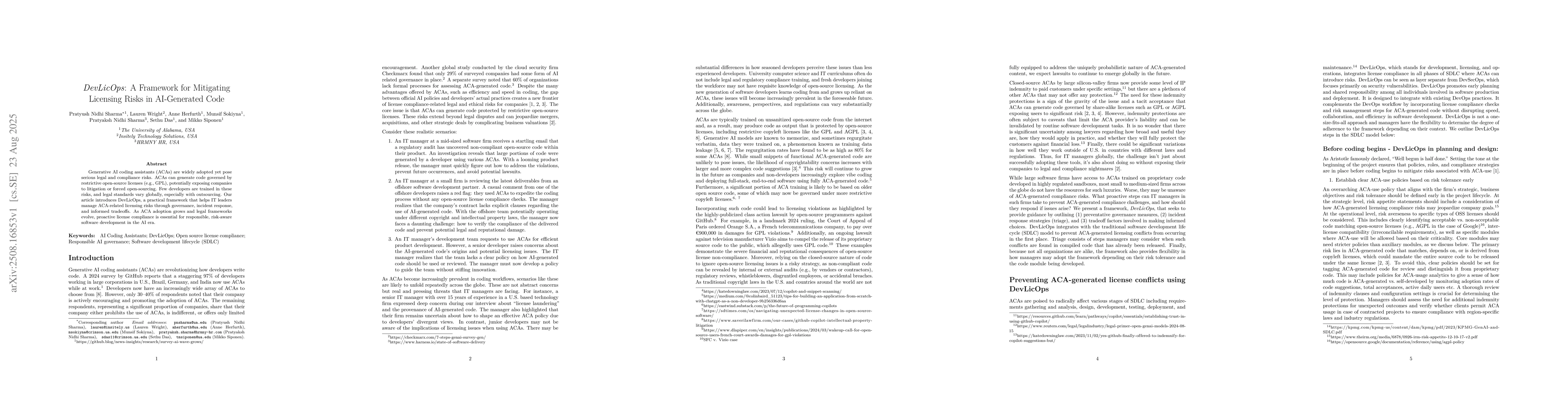 Generative AI coding assistants (ACAs) are widely adopted yet pose serious legal and compliance risks. ACAs can generate code governed by restrictive open-source licenses (e.g., GPL), potentially exposing companies to litigation or forced open-sourcing. Few developers are trained in these risks, and legal standards vary globally, especially with outsourcing. Our article introduces DevLicOps, a practical framework that helps IT leaders manage ACA-related licensing risks through governance, incident response, and informed tradeoffs. As ACA adoption grows and legal frameworks evolve, proactive license compliance is essential for responsible, risk-aware software development in the AI era.